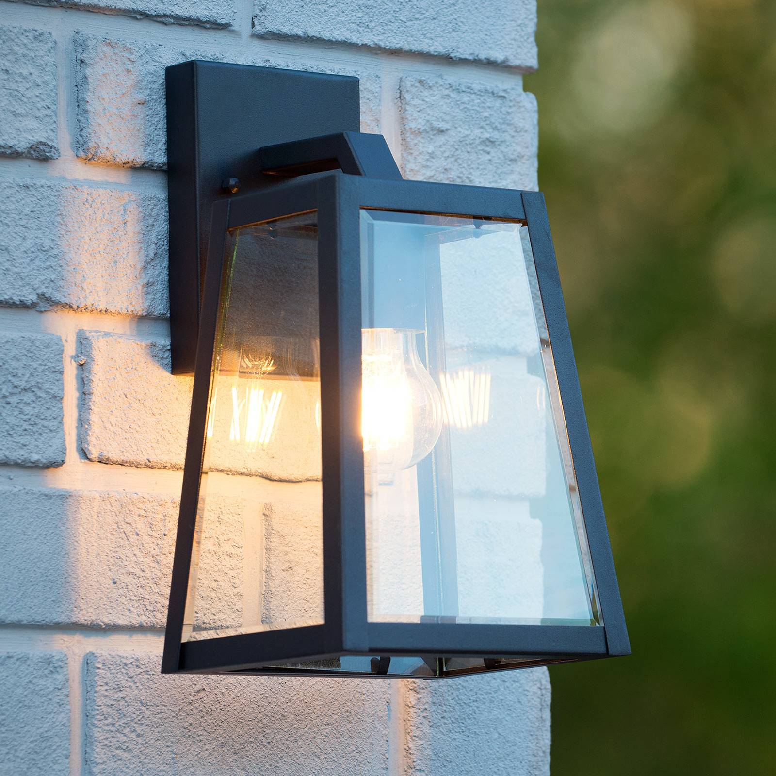Buitenwandlamp Matslot van matzwart metaal en helder glas De Matslot buitenmuurarmatuur past zowel op de gevel van rustiek ontworpen gebouwen als op de muur van een landhuis of modern gebouw, omdat hij in een zeer rechte lijn uit mat zwart metaal en helder glas is vervaardigd. Zowel de muurbeugel als de kap, die naar beneden toe iets breder wordt en voorzien is van heldere glasplaten met een mooie facetafsnijding aan de rand, zijn in een vierkante vorm gevormd. Het hangt aan een kleine beugel aan de muurbeugel die naar beneden gericht is. Het heldere glas van de kap zorgt voor een goed zicht op de lamp. Om een optisch effect te bereiken zoals het getoonde model, raden wij het gebruik aan van een gloeilamp in een gloeilamp of een rustieke vorm. De verlichting is niet inbegrepen.