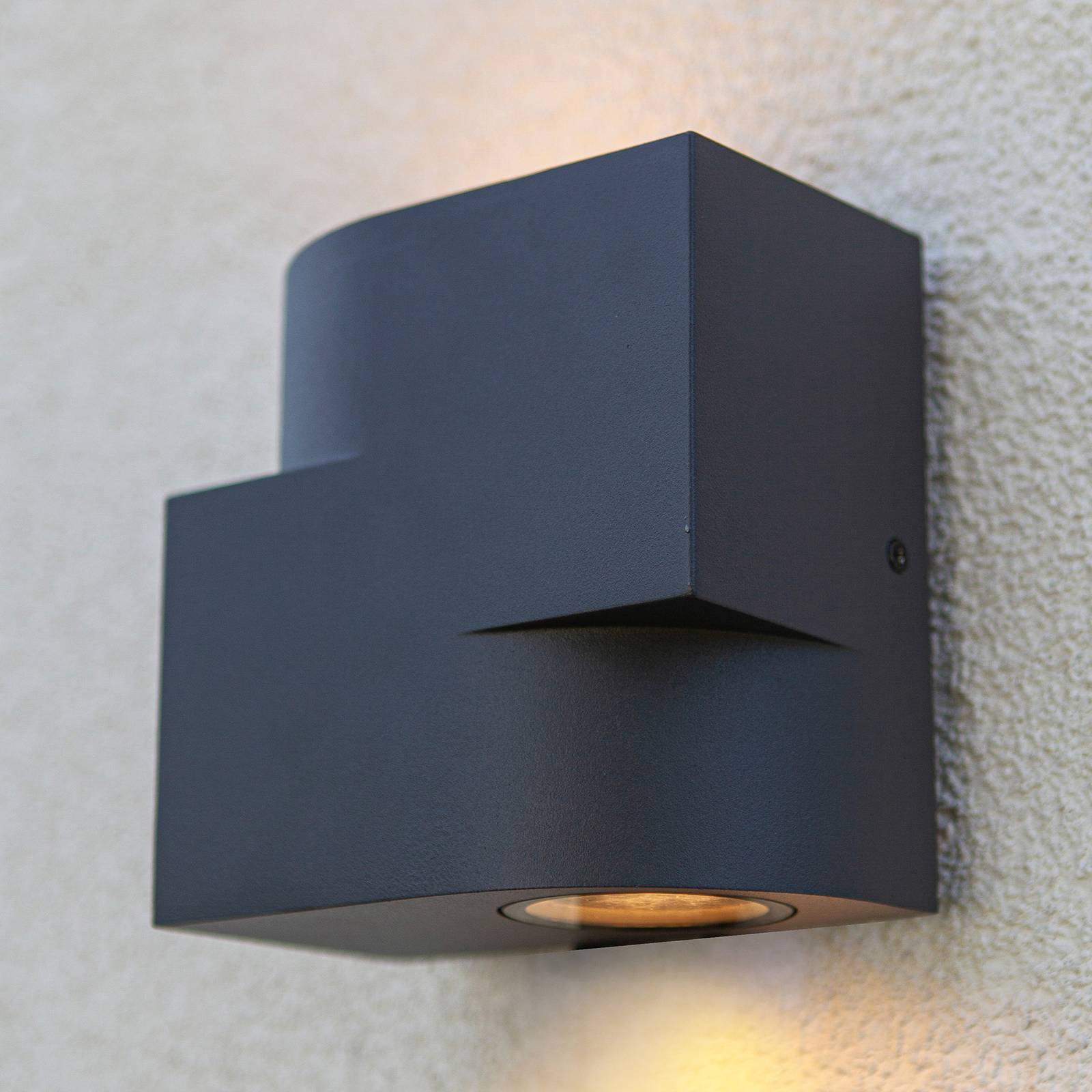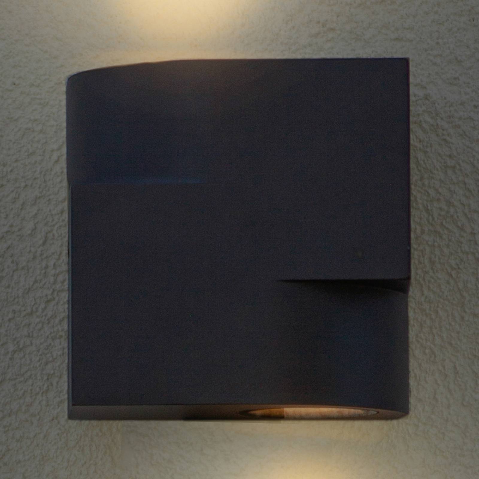 De buitenwandlamp Marbo, gemaakt van aluminium en gelakt in antraciet, combineert ronde en hoekige vormen. Ze schijnt zowel naar boven als naar beneden en biedt plaats aan twee GU10-lampen van elk maximaal 15 watt (niet inbegrepen). Marbo is beschermd tegen spatwater.