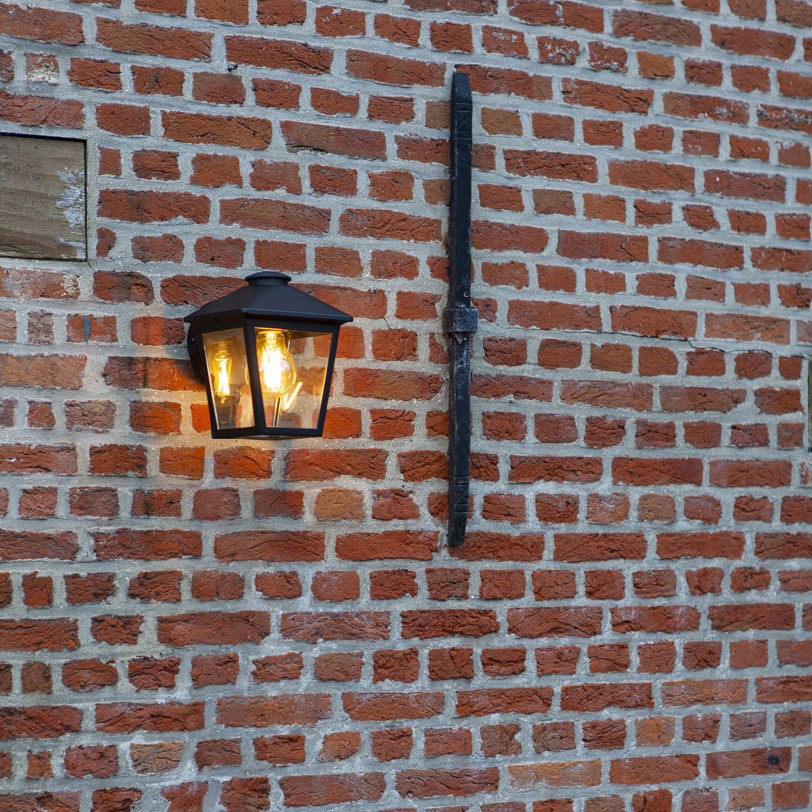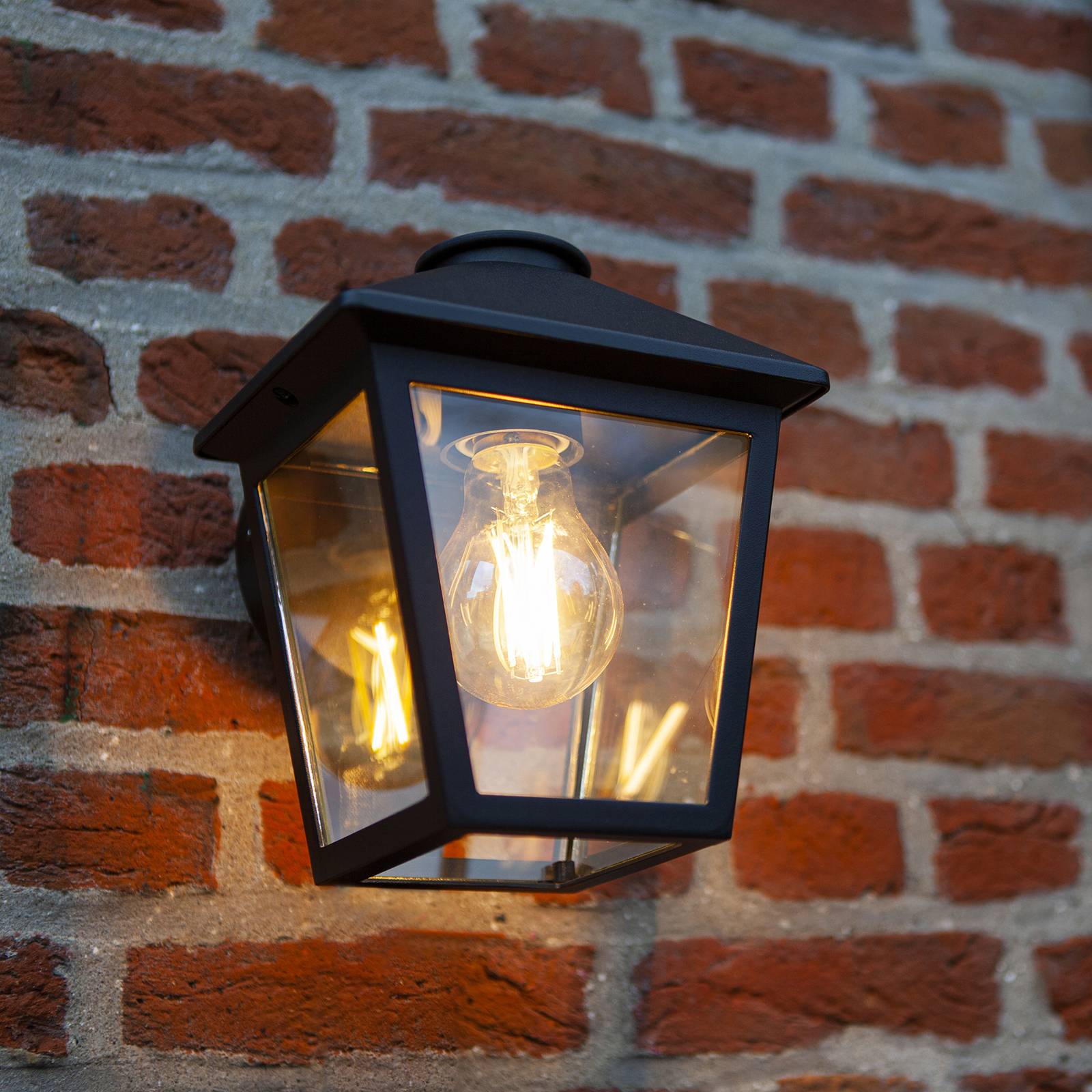 Lantaarnvormige buitenwandlamp Zago met kappen van helder glas De Zago buitenwandlamp van gegoten aluminium is ontworpen in de vorm van een lantaarn en heeft rondom helder glas waardoor de lamp zichtbaar is. Ze ziet er bijzonder mooi uit met een filament lamp.