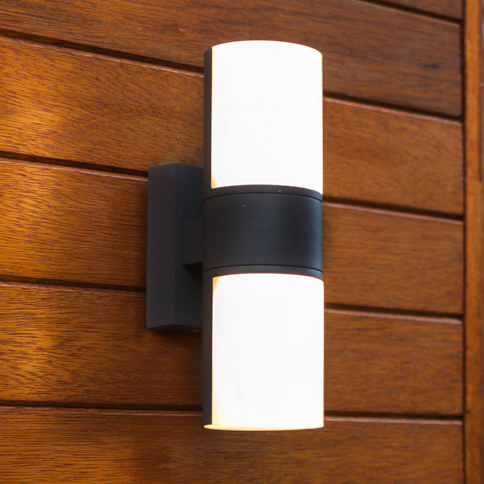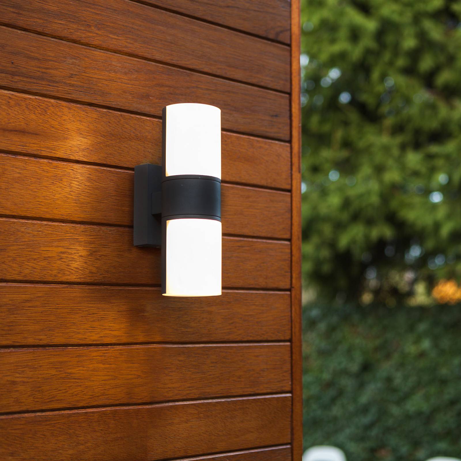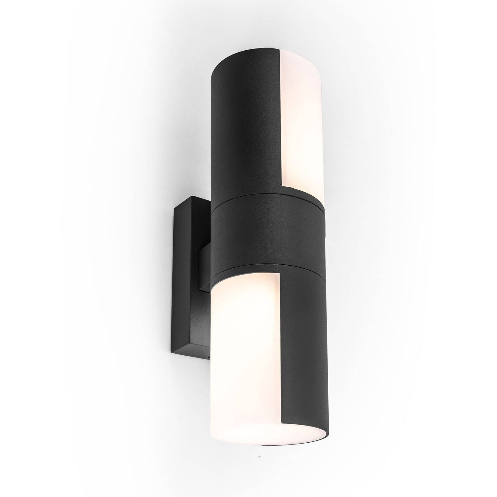 Tweelamps LED-wandlamp Cyra met twee draaibare lichtbronnenDe buitenwandlamp Cyra van cilindervormig, zwart gegoten aluminium heeft twee lichtbronnen. Beide zijn onafhankelijk van elkaar draaibaar en kunnen zowel indirecte als directe verlichting aan het huis bieden. De warmwitte LED’s zijn verborgen achter diffusers en zorgen voor een gelijkmatige lichtsfeer. Horizontale montage is ook hier mogelijk.- draaibaar naar links tot 260 °, naar rechts tot 90 °