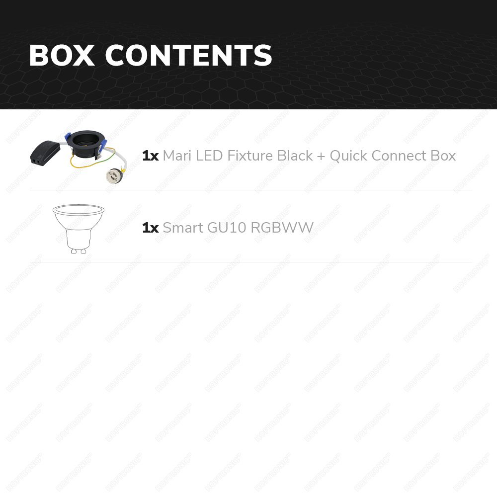 De Mari smart LED inbouwspot is handig te installeren door het plug & play systeem dat aan de spot geplaatst zit, dit systeem bestaat uit een GU10 fitting en een aansluitdoos. Sluit de spot thuis een handomdraai aan op het lichtnet en installeer de meegeleverde GU10 lichtbron in de GU10 fitting. Deze inbouwspot wordt direct aangesloten op het 230V lichtnet waardoor je geen trafo hoeft weg te werken.