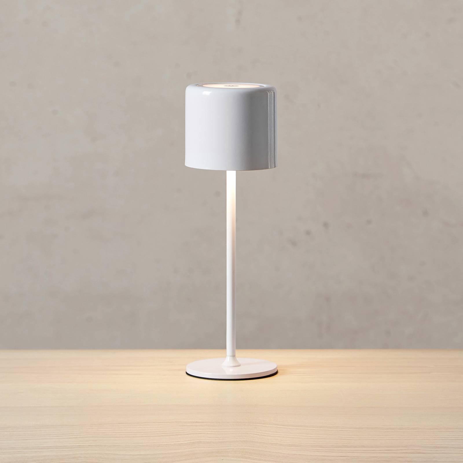 Draagbare en oplaadbare tafellamp. Gemakkelijk mee te nemen van kamer naar kamer en buiten te gebruiken. De lamp werkt op batterijen en kan tot 8 uur draadloos gebruikt worden. IP44-classificatie en geschikt voor tijdelijk buitengebruik. Toegankelijke touchdimmer en schakelaar op de bovenkant van de kap. Perfect voor buiten op warme zomeravonden, aan de eettafel of als draagbaar nachtlampje. Verspreidt een aangenaam sfeerlicht.