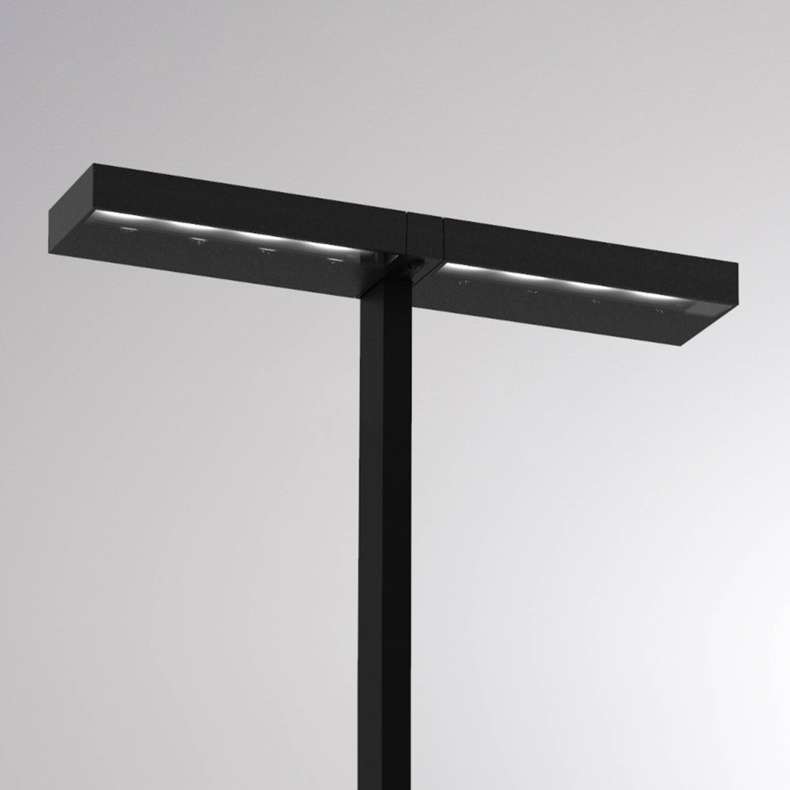 Concept Double F LED vloerlamp met twee armatuurkoppen en pushdimmer De Concept Double F LED staande armatuur is ideaal voor de verlichting van kantoorruimtes. De twee armatuurkoppen maken het ideaal voor het verlichten van meerdere werkplekken. De staande lamp geeft direct licht op het werkvlak en straalt tegelijkertijd naar boven, zodat naast een gerichte taakverlichting ook een indirecte ruimteverlichting ontstaat. De ingebouwde lichtgevende diodes stralen universeel wit licht uit dat de concentratie bevordert, vooral bij het werken aan een computerscherm. De helderheid kan worden aangepast via de push-dim functie en aan elke situatie worden aangepast. De behuizing van de Concept Double F is gemaakt van hoogwaardig aluminium. Door haar lineaire vorm oogt ze bijzonder geraffineerd, zodat de vloerlamp moeiteloos kan worden geïntegreerd in moderne kantoorruimten. – Lichtemissie: direct/indirect (30:70) – Verblindingswaarde (UGR):