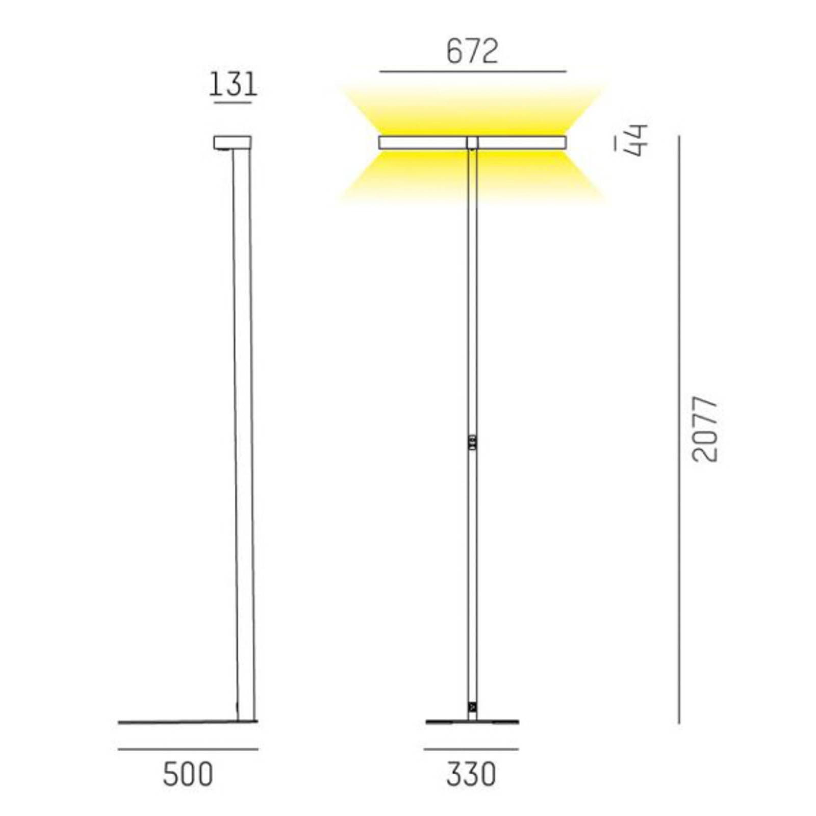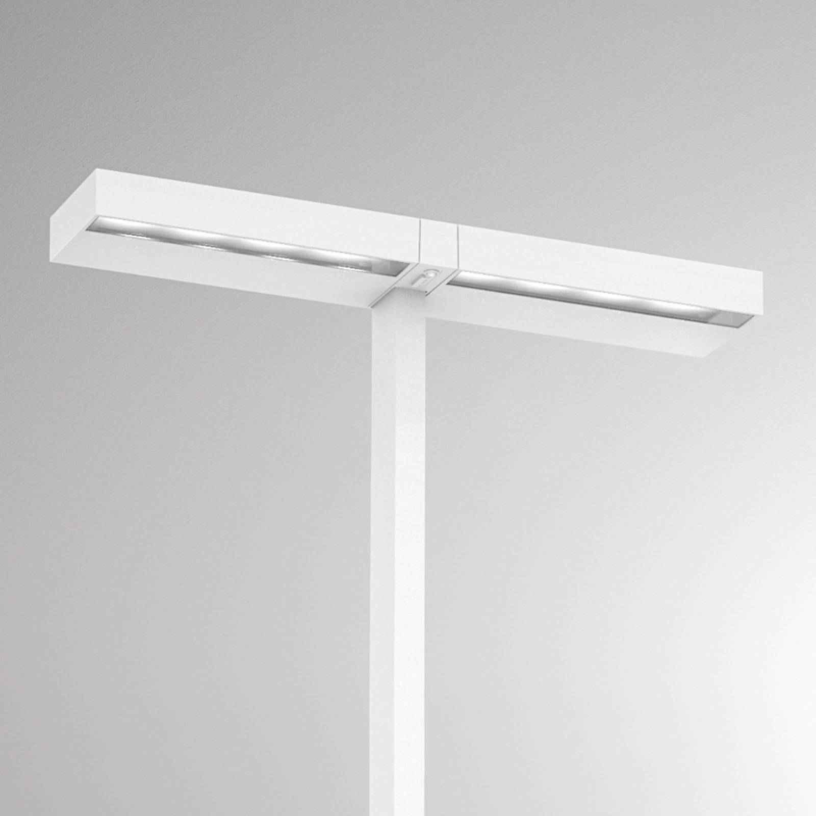 Concept Double F tweekoppige LED vloerlamp – uitgerust met sensorbesturing De LED-staanlamp Concept Double F met zijn twee armatuurkoppen is virtueel gemaakt voor een royale basisverlichting in het kantoor en een directe verlichting van twee werkplekken. De twee armatuurkoppen zijn links en rechts op de standaard gemonteerd en stralen het universele witte licht van de geïntegreerde LED’s zowel naar boven als naar beneden uit. Dankzij de geïntegreerde daglichtsensor past de bureaulamp de lichtsterkte automatisch aan het omgevingslicht aan wanneer het donker wordt, zodat de werknemer verzekerd is van constante lichtomstandigheden aan zijn bureau. Bovendien is de vloerlamp voorzien van een bewegingsdetector die reageert op de aanwezigheid van personen en bijdraagt tot een lager energieverbruik door de armatuur automatisch uit te schakelen na een bepaalde tijd zonder geregistreerde beweging. Zodra de sensor weer beweging rondom de LED vloerlamp detecteert, gaat het licht vanzelf weer aan. – Lichtemissie: direct/indirect (30:70) – Verblindingswaarde (UGR):