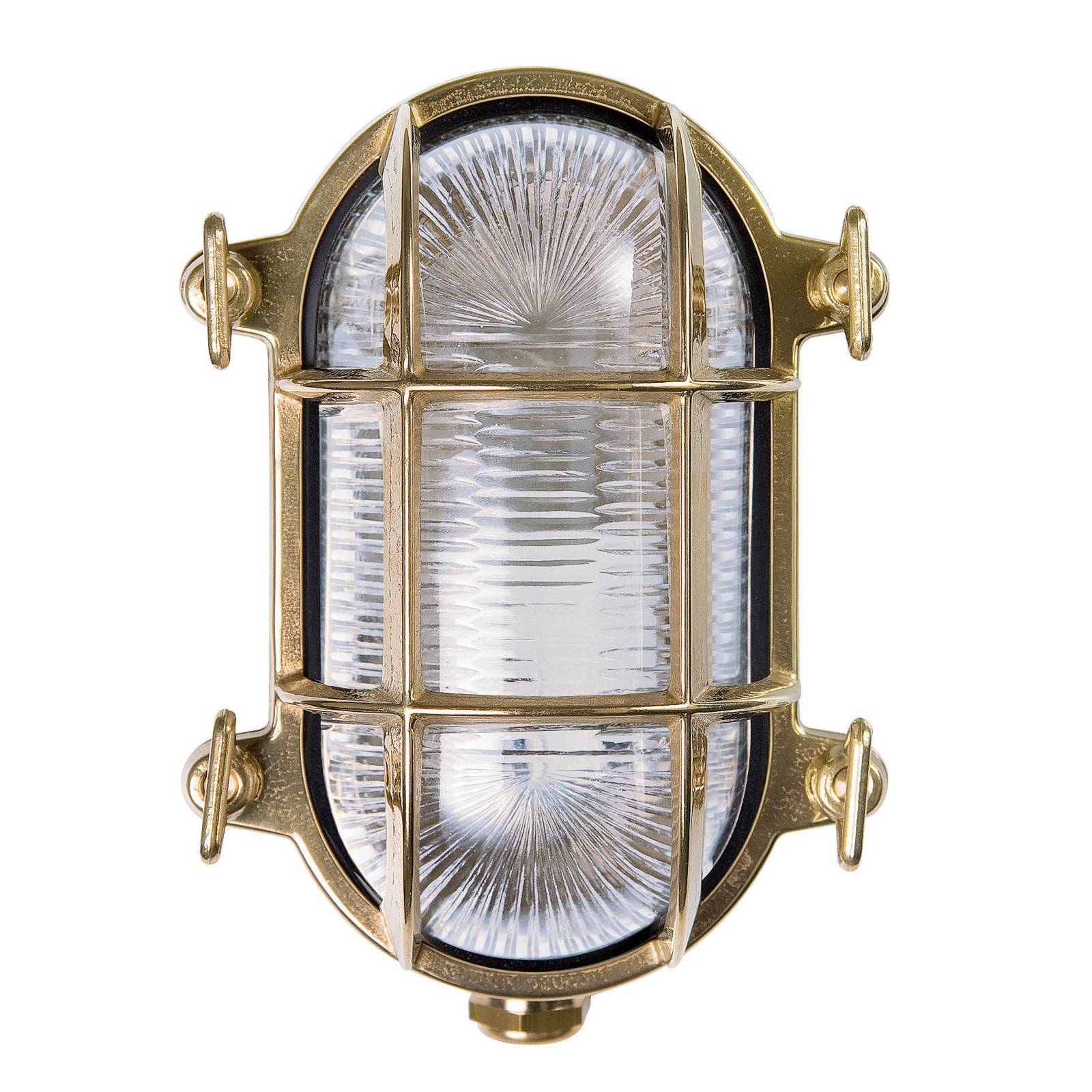 Buitenwandlamp Tortuga in ovale vorm, gemaakt van messing en glas Tortuga is een robuuste buitenwandlamp in ovale vorm, die is gemodelleerd naar een klassiek scheepsbeslag. De armatuur, die in Italië van massief messing en glas is gemaakt en zowel aan de wand als aan het plafond kan worden bevestigd, wordt gekenmerkt door haar kwaliteit en haar bestendigheid tegen zeewater en is daarom ook geschikt voor montage in de buurt van de zee. Het heldere glas van de armatuur zit achter een beschermrooster, waardoor het licht van de lamp vrijwel ongehinderd kan stralen.