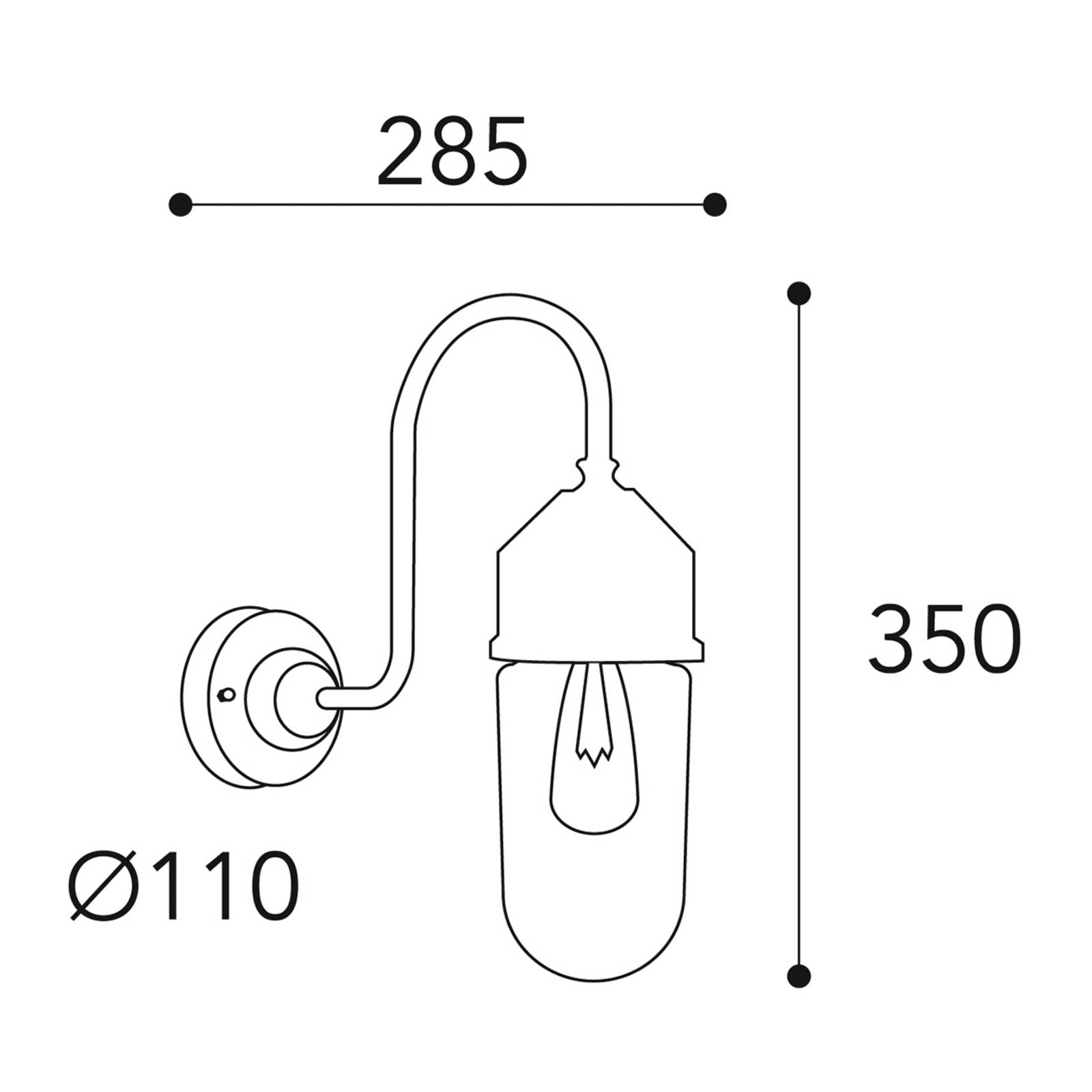 Wandlamp voor buiten 1950N met mooie glazen kapMet de wandlamp voor buiten 1950N, die met haar prachtige antieke design overal in het oog springt, kan elke rustieke, antieke of mediterrane woonsfeer in stijl worden ingericht.Overdag gewoon een stijlaccentuerende accessoire, de lichtverdeler met de sterk gebogen lamparm en de vormige glazen kap, die het licht naar alle kanten uitstraalt, zet zijn omgeving in het donker in het juiste licht.Een geweldige wandlamp, bijvoorbeeld voor de entree van het huis.