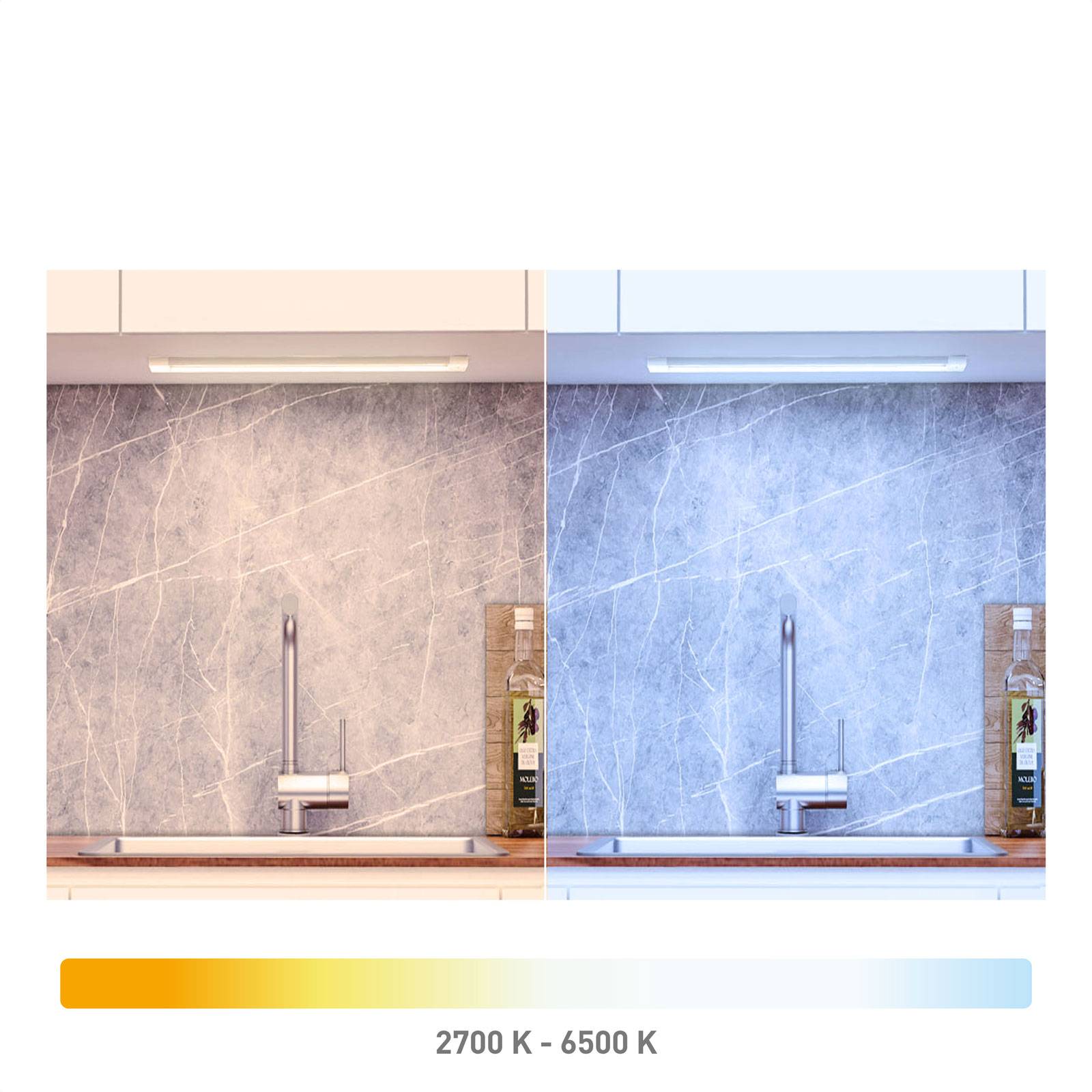 tint LED meubelverlichting Alba – dimbaar met tiptoets, slim te bedienen met App, afstandsbediening of spraakassistent Die moderne LED meubelverlichting Alba uit de smart tint productserie kan eenvoudig worden aangesloten op een op ZigBee gebaseerde Smart Home. Die maakt het mogelijk om de moderne lamp te bedienen met je eigen smartphone, tablet of een geschikte spraakassistent. Als je geen SMART+ hebt, kun je de lamp ook bedienen met een geschikte afstandsbediening. Die basisfuncties zoals dimmen, de lichttemperatuur veranderen en meerdere tinten samen schakelen zijn ook hier mogelijk. Op de klassieke manier kan het licht ook rechtstreeks op de Lamp worden in- en uitgeschakeld met een aanraakschakelaar, ongeacht of deze is aangesloten op een systeem of niet, en kan het licht worden gedimd door de schakelaar ingedrukt te houden. Die standaard is warmwit. Bij gebruik van de afstandsbediening of de app kan het witte licht ook worden geselecteerd in een spectrum van warmwit tot daglicht. Functies/compatibiliteit: – regelbaar via een geschikte afstandsbediening met tint (zie accessoires) – regelbaar via een app op basis van de draadloze ZigBee-standaard 3.0 – compatibel met de spraakassistent Alexa (Amazon) – kan worden geïntegreerd in op ZigBee gebaseerde SMART+ Home-systemen, bijvoorbeeld met Philips Hue, Osram Lightify etc. – sfeerverlichting op maat in wit (2.700 tot 6.500 K) – dimbaar