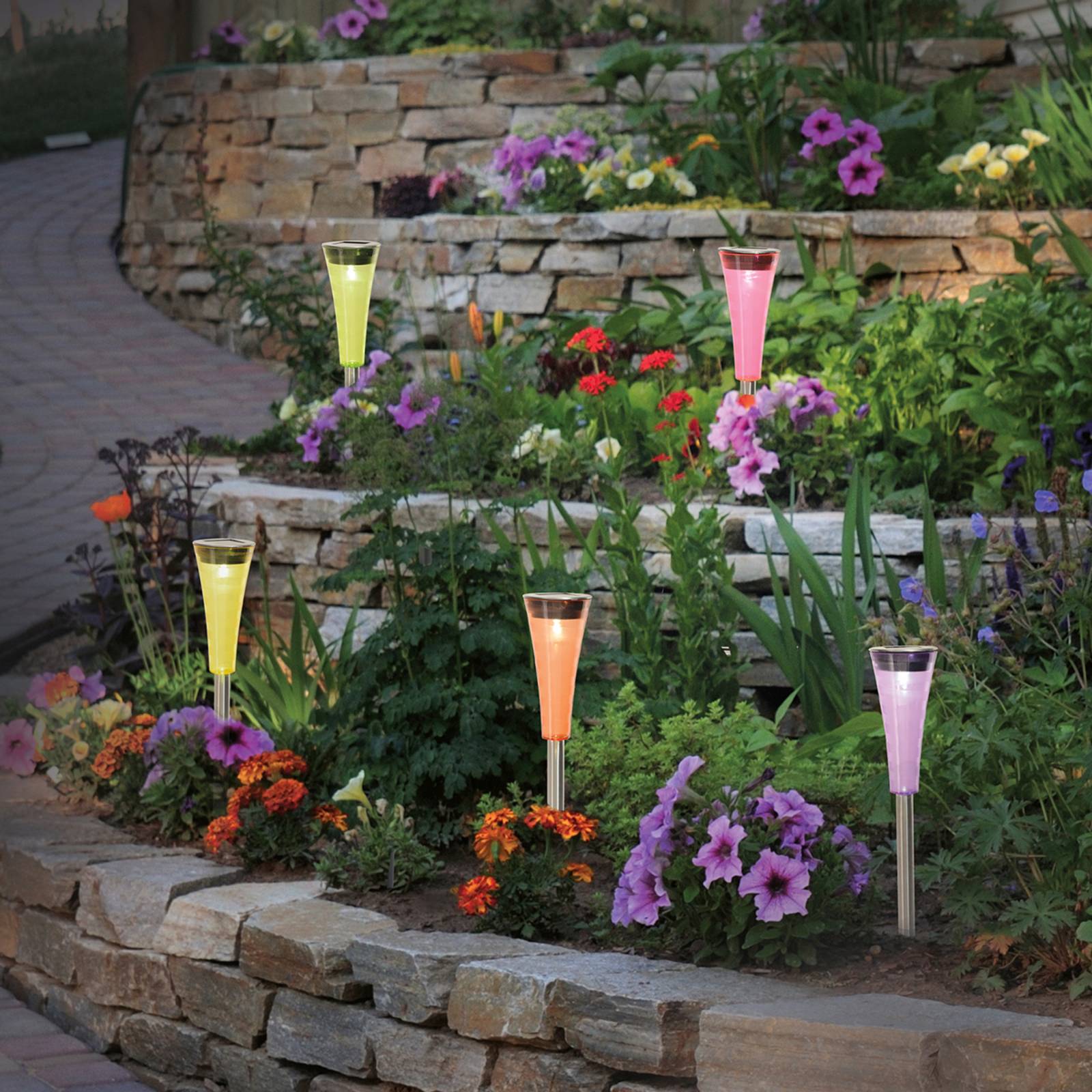 Set van 5 – kleurrijke Colorato grondspieslampen op zonne-energie met LED Deze vijf Colorato grondspieslampen op zonne-energie brengen kleur in uw woning. De kleurrijke decoratieve lampen kunnen overal worden geplaatst, want ze zijn volledig onafhankelijk van het elektriciteitsnet dankzij hun geïntegreerde zonnepaneel. Gewoon in het bloembed geplaatst, laadt de geïntegreerde batterij overdag op via zonne-energie, zodat de LED in het donker begint te gloeien. De verschillend gekleurde, trechtervormige kappen zorgen voor kleurrijke lichteffecten.
