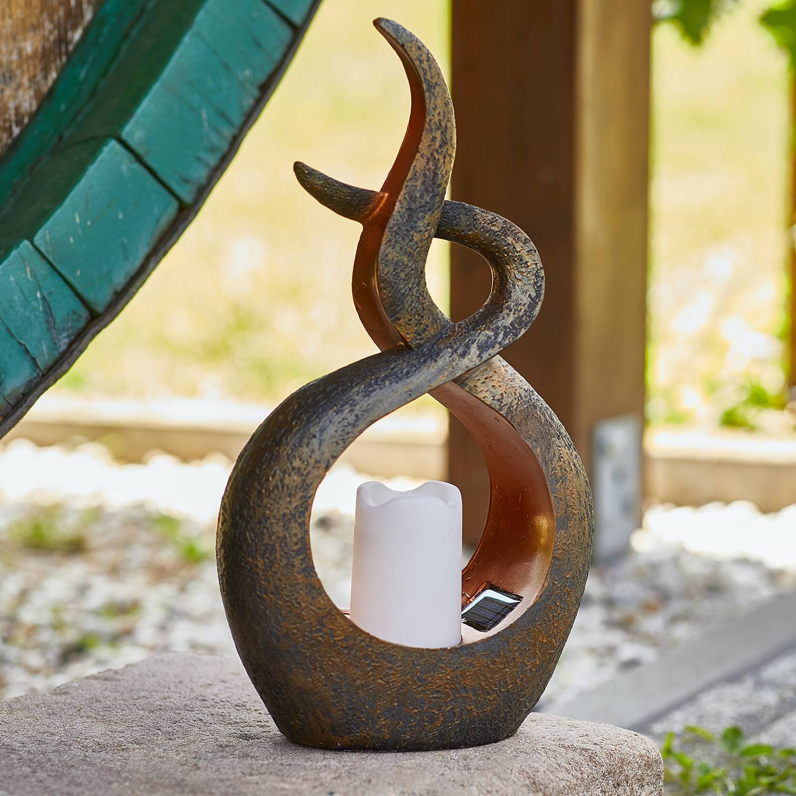 Lamp op zonne-energie Oriental met kaarsen imitatie in een metalen montuur De LED sfeerlamp op zonne-energie verspreidt een beetje oosterse charme. Ze werd uit metaal vervaardigd, die in een mooie bruine en kopertint werd voorzien. Op de bodem van dit metalen element zit een bedrieglijk echte imitatie van een kaars met LED’s erin. Uitgerust met een amorf zonnepaneel en een accu (1 x AA Ni-MH 1,2V 300 mAh), worden de in de kaars ingebouwde LED’s met energie voorzien en beginnen dankzij een geïntegreerde schemersensor bij het invallen van de duisternis te flikkeren. verlichtingsduur tot 8 uren.