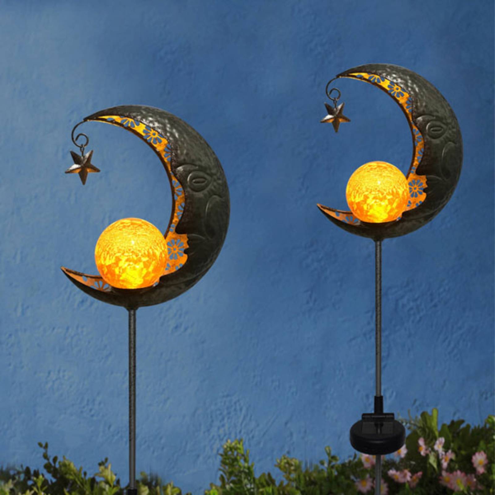 Decoratieve maan op zonne-energie met warmwitte LED’s en vlameffect De speelse LED lamp op zonne-energie maan zal elke tuin of buitenruimte opfleuren. Zoals de naam al doet vermoeden, zit een maansikkel met een klein gezichtje op een grondspies en houdt beschermend een oranje gekleurde bol vast, die moderne en energiezuinige LED’s bevat. Deze worden gevoed door het zonnepaneel en flikkeren in de avonduren met een aangenaam warmwit licht als kleine vlammetjes. De maan is gemaakt van gegalvaniseerd metaal, terwijl de bol met de LED’s van glas is. De tuinlamp kan ook worden in- en uitgeschakeld met een kleine schuifschakelaar.