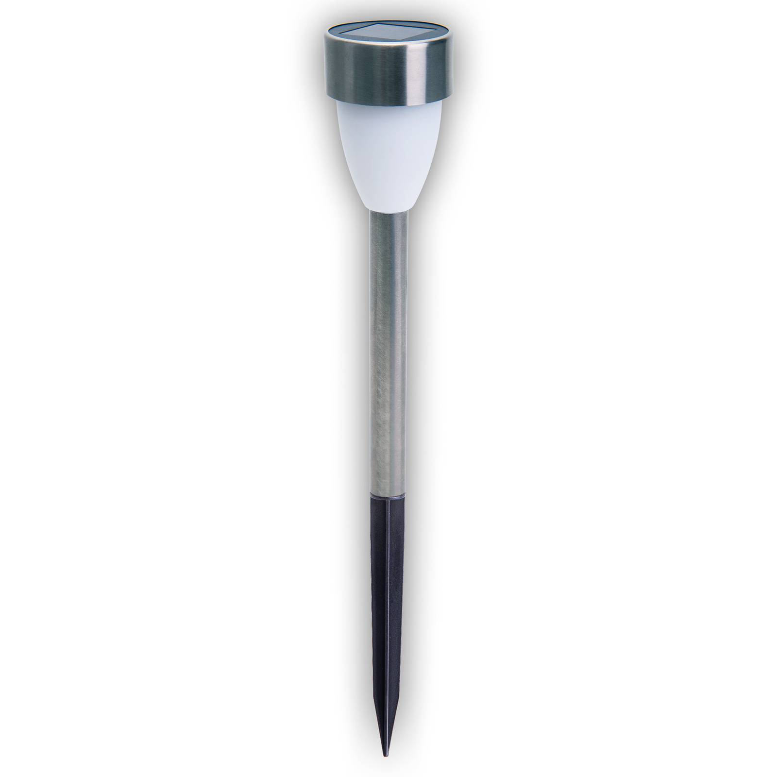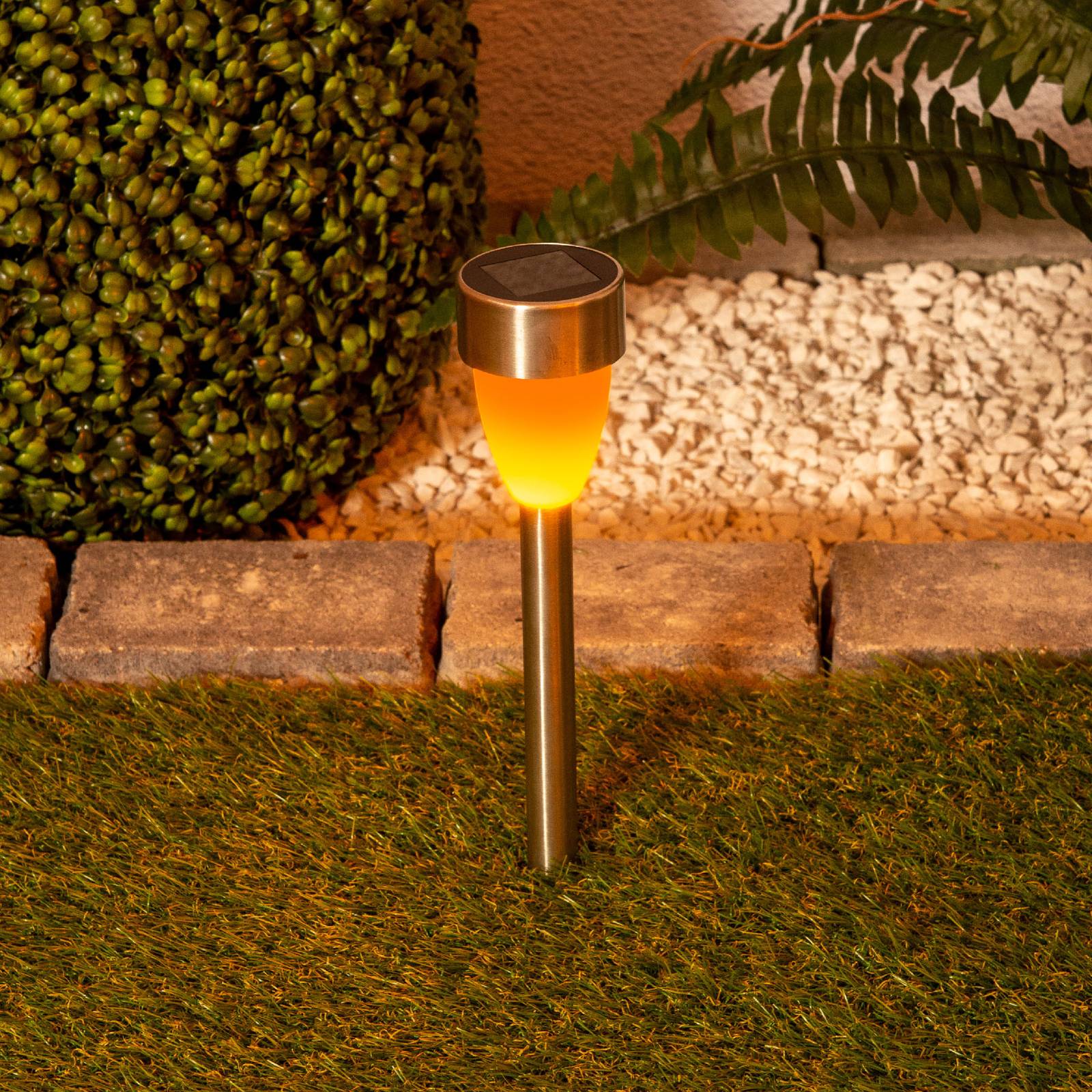 Deze decoratieve lamp op zonne-energie wordt geleverd in een praktische set van 6 stuks. De lampen hebben de vorm van kleine sokkellampjes en zijn gemakkelijk te installeren in zachte grond. De roestvrijstalen behuizing in combinatie met de heldere kunststof kap, die een warmwit licht met vlameffect uitstraalt, zorgt voor een moderne look. Dankzij de geïntegreerde oplaadbare batterij en het zonnepaneel kan de lamp volledig onafhankelijk worden gebruikt. – Verlichtingsduur 6 uur