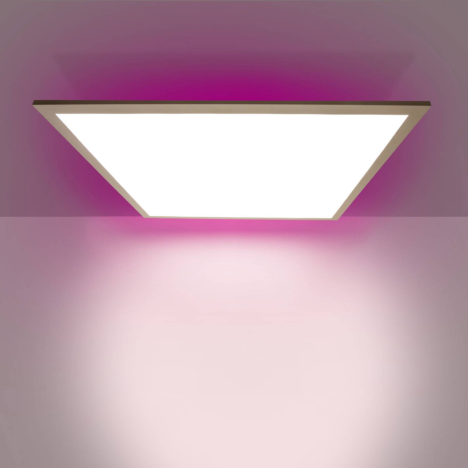 Modern en slim regelbaar LED-paneel met achtergrondverlichting en nachtlichtfunctie De moderne LED panel Backlight is een eenvoudige plafondlamp die schittert door zijn functies. Het heeft twee lichtbronnen die indirect naar het plafond schijnen en direct naar beneden. Het directe licht straalt in klassiek wit en kan gemakkelijk in kleurtemperatuur worden gevarieerd van warm wit tot daglicht. Het indirecte licht wordt geleverd door een RGB-strip die kleurrijke effecten creëert naar het plafond toe. Het LED-paneel kan worden in- en uitgeschakeld met de meegeleverde afstandsbediening, de gratis Tuya-app of een stemassistent. Het licht kan niet alleen worden in- en uitgeschakeld, maar ook handig worden gedimd of van kleur veranderd. Een bijzonder pluspunt van het nachtlampje is de geïntegreerde memory-functie, die de laatst gekozen instelling onthoudt tot de volgende keer dat het lampje wordt aangezet. Functies / compatibiliteit: – Bedienbaar en dimbaar via de gratis Tuya Smart app (beschikbaar voor iOS en Android), alsook via de meegeleverde afstandsbediening. – compatibel met spraakassistenten zoals Amazon Echo, Google Home, Apple HomeKit – Indirect licht: RGB-streep – Direct licht inclusief CCT-kleurwijzigingsfunctie – Direct en indirect licht kunnen afzonderlijk worden geschakeld – Nachtlampje/geheugenfunctie inbegrepen