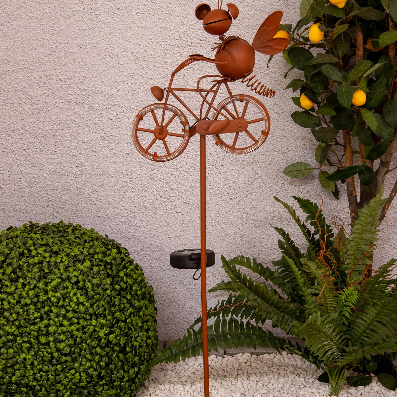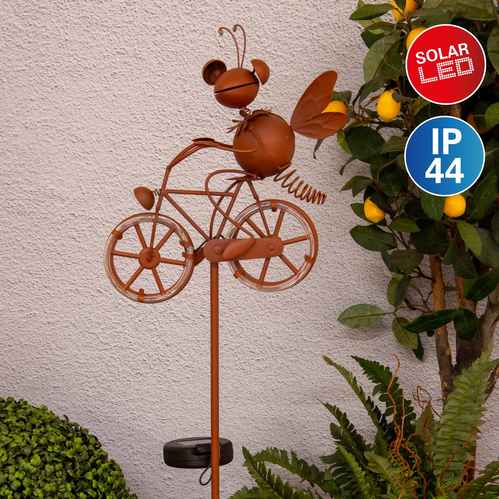 Visueel stelt de bruine, metalen LED lamp op zonne-energie een insect op een fiets voor, vastgehouden door een slanke paal waarop in het midden het discrete zonnepaneel is geplaatst. De wielen van de fiets zijn voorzien van kleine LED-lichtpunten die fel oplichten als de batterij is opgeladen. De ideale sfeerlamp voor in de tuin – beschermingsgraad IP44