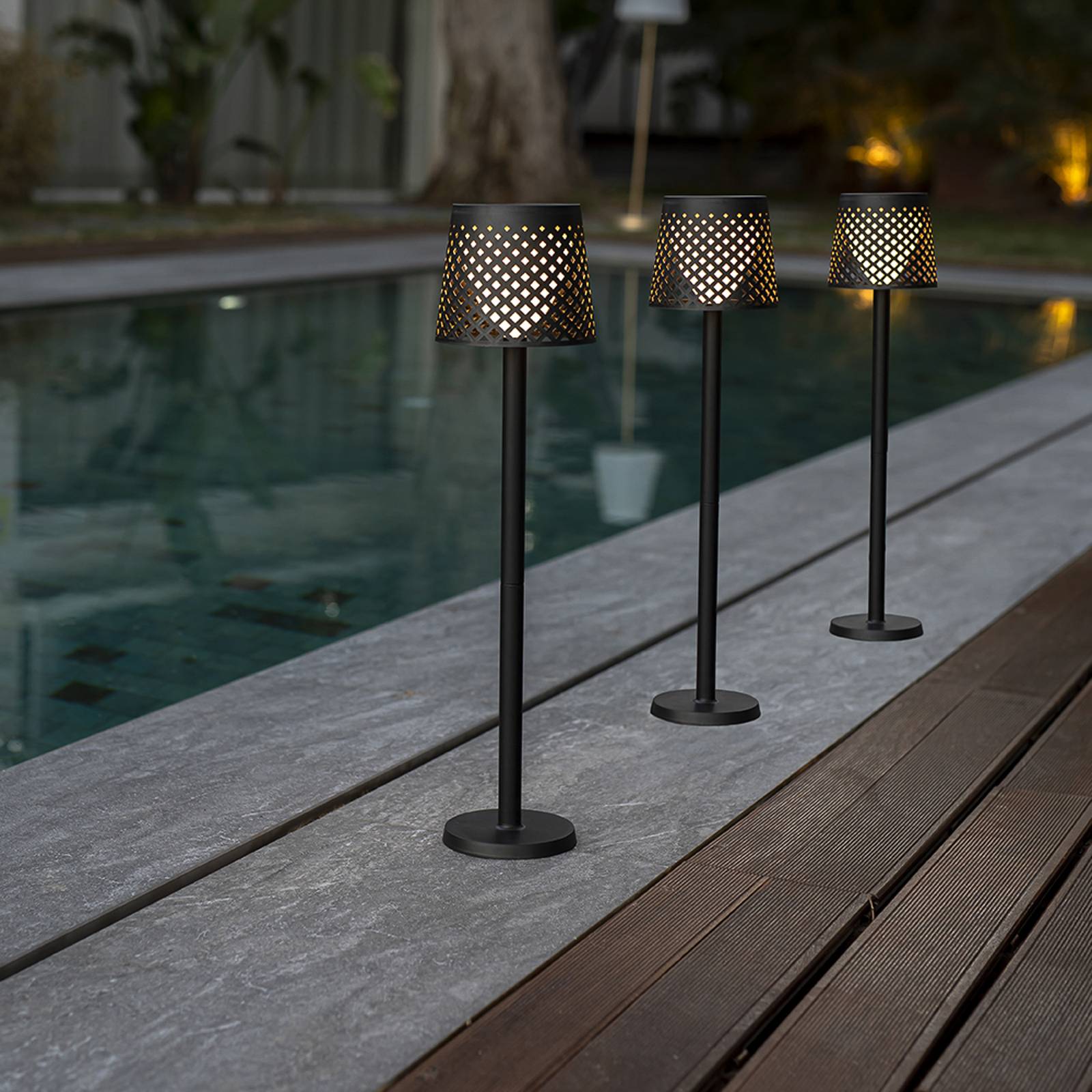 Decoratieve LED-zonnelamp Greta met vijf gebruiksmogelijkheden De LED-zonnelamp Greta is een echte allrounder en overtuigt door haar veelzijdige gebruiksmogelijkheden. Zij kan bijvoorbeeld worden gebruikt als tafellamp (hoogte 30 cm of 64 cm), als grondspieslamp (hoogte 46 cm of 80 cm) en als wandlamp. Aan de bovenzijde heeft Greta een geïntegreerde zonnemodule, zodat hij zonder extra stroomkabel kan worden gebruikt. Het is echter ook mogelijk om de lamp op te laden via de meegeleverde USB-kabel. De praktische schemeringssensor schakelt de solarlamp aan zodra het donker wordt. Greta is gemaakt van gerecycled plastic uit meren en de zee. – Lichtduur tot 30 uur – Oplaadtijd 4 – 8 uur