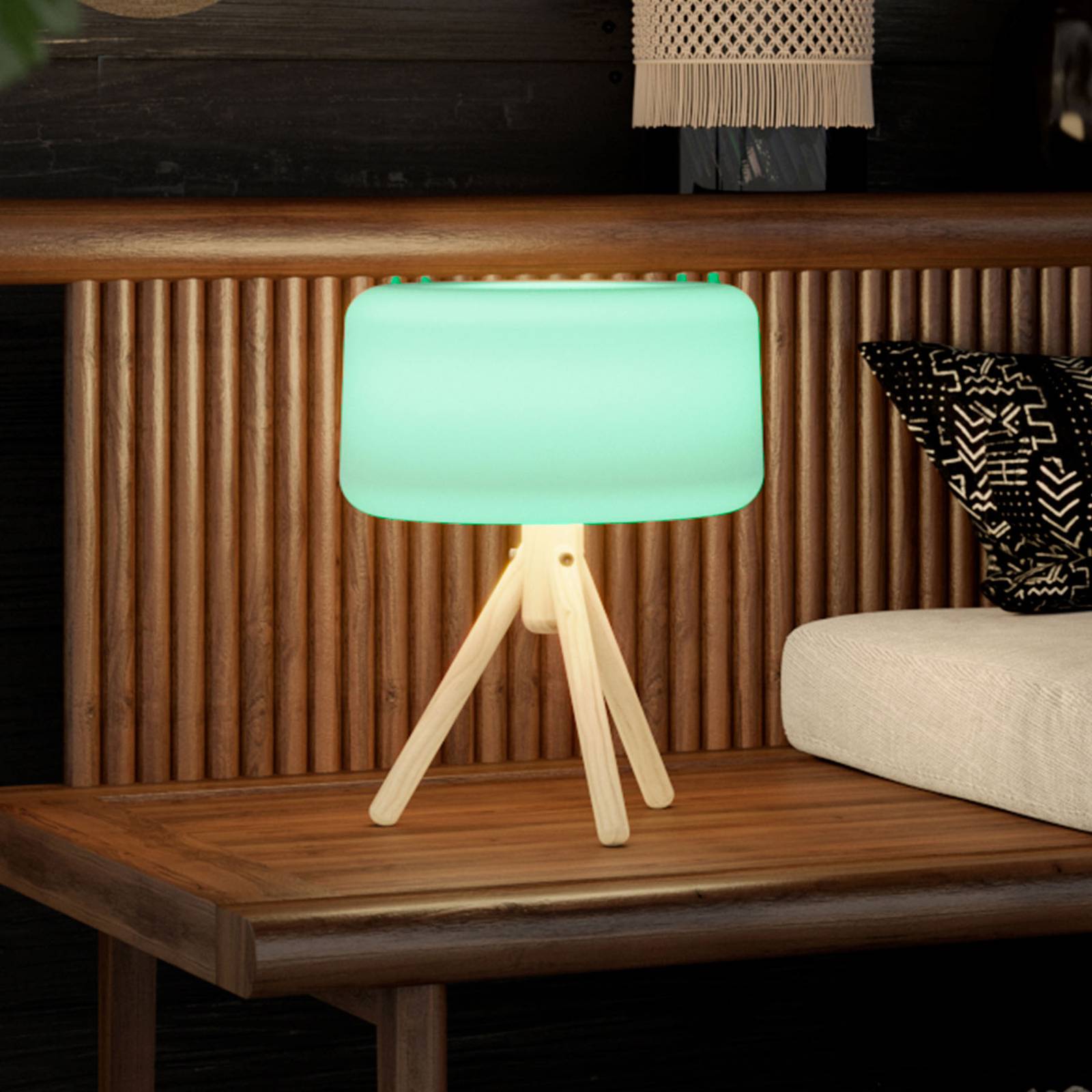 Chloe LED tafellamp met houten driepoot, oplaadbare batterij en zonnepaneel Chloe is een LED tafellamp met een geïntegreerde oplaadbare Akku en zonnepaneel die gratis voor verlichting kan zorgen, maar ook aan een stopcontact kan worden opgeladen met behulp van de meegeleverde oplaadkabel. De lamp bestaat uit een driepoot van hout en een cilindervormige, gesloten kap van polyethyleen met zacht afgeronde Kanten en is niet alleen een bron van licht, maar ook een aantrekkelijke decoratie op de terrastafel in een privéomgeving of in een horecagelegenheid buiten. Een afstandsbediening is ook inbegrepen. Gekleurde verlichting in 256 verschillende kleuren of wit licht in drie verschillende witte lichtkleuren kan gemakkelijk worden geselecteerd en de lichtsterkte kan worden aangepast met de afstandsbediening. Die kan handmatig of automatisch worden ingeschakeld via de geïntegreerde schemersensor – incl. oplaadbare 2.000 mAh lithiumbatterij – incl. laadkabel en afstandsbediening – verlichtingstijd met volle batterij 12 tot 36 uur – laadtijd ca. 2 – 6 uur