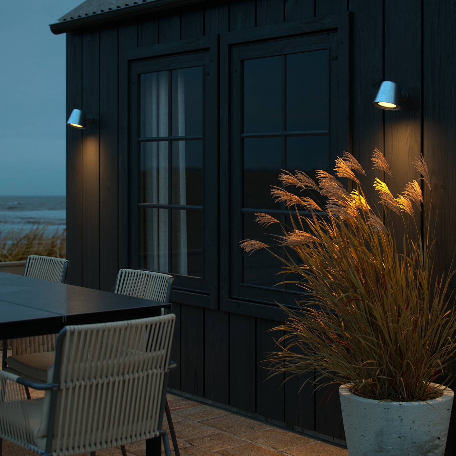 De Aleria buitenwandlamp is gemaakt van gegalvaniseerd staal en is een modern vormgegeven armatuur dat weinig ruimte inneemt en een direct, neerwaarts licht geeft bij de ingang van het huis, in de garage of op de oprit.
