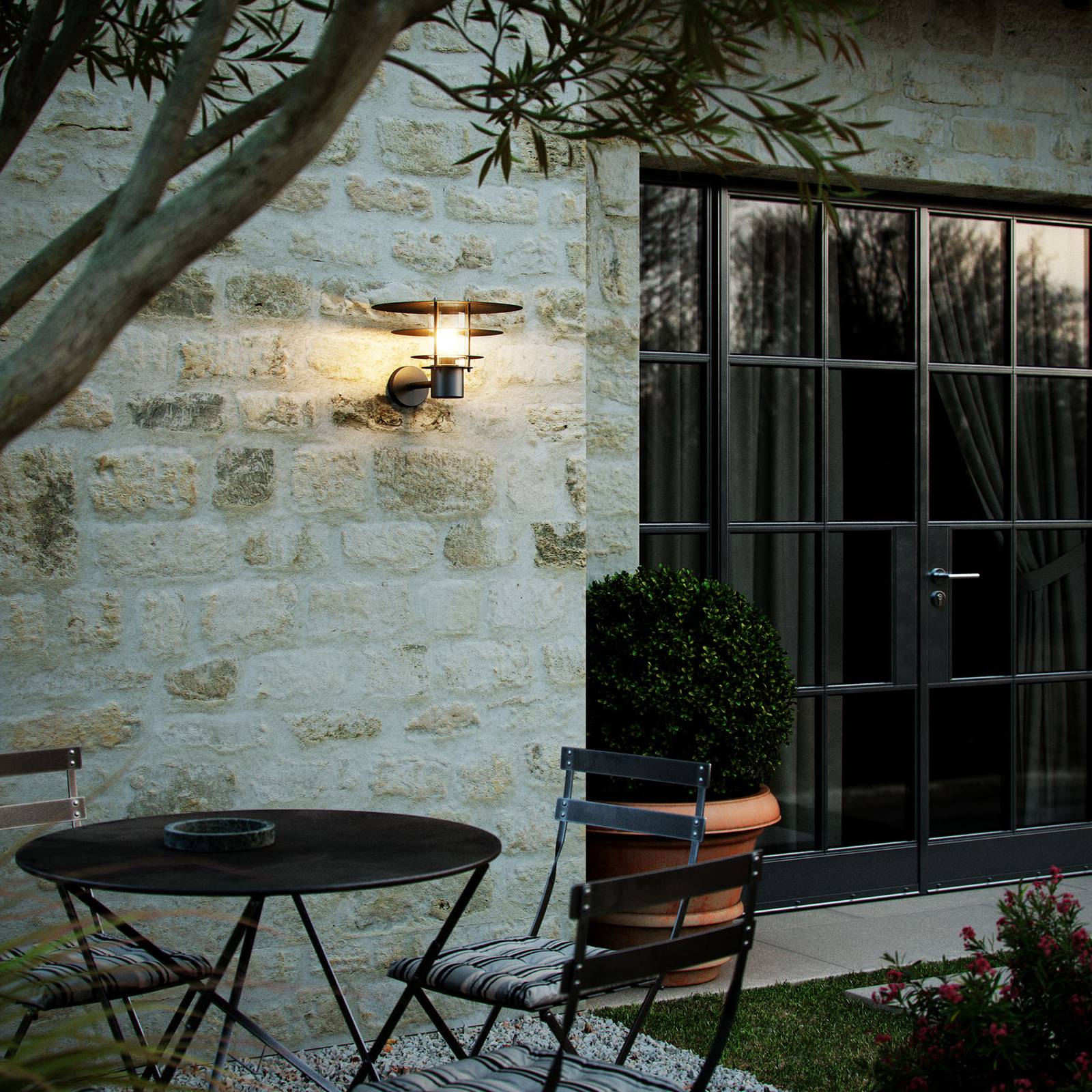 Moderne buitenwandlamp Bastia in zwart De Bastia wandlamp voor buitengebruik bestaat uit een wandarm en een kap. De lampenkap is samengesteld uit vier zwarte schijven die naar boven toe groter worden. Een lichtbron is geplaatst achter een diffuse kunststof bescherming en kan rechtstreeks via de accessoires worden besteld. Het licht is nuttig voor de oriëntatie rond het huis of de veranda en past ook perfect bij gestructureerde wanden, zoals hout of klinkers.