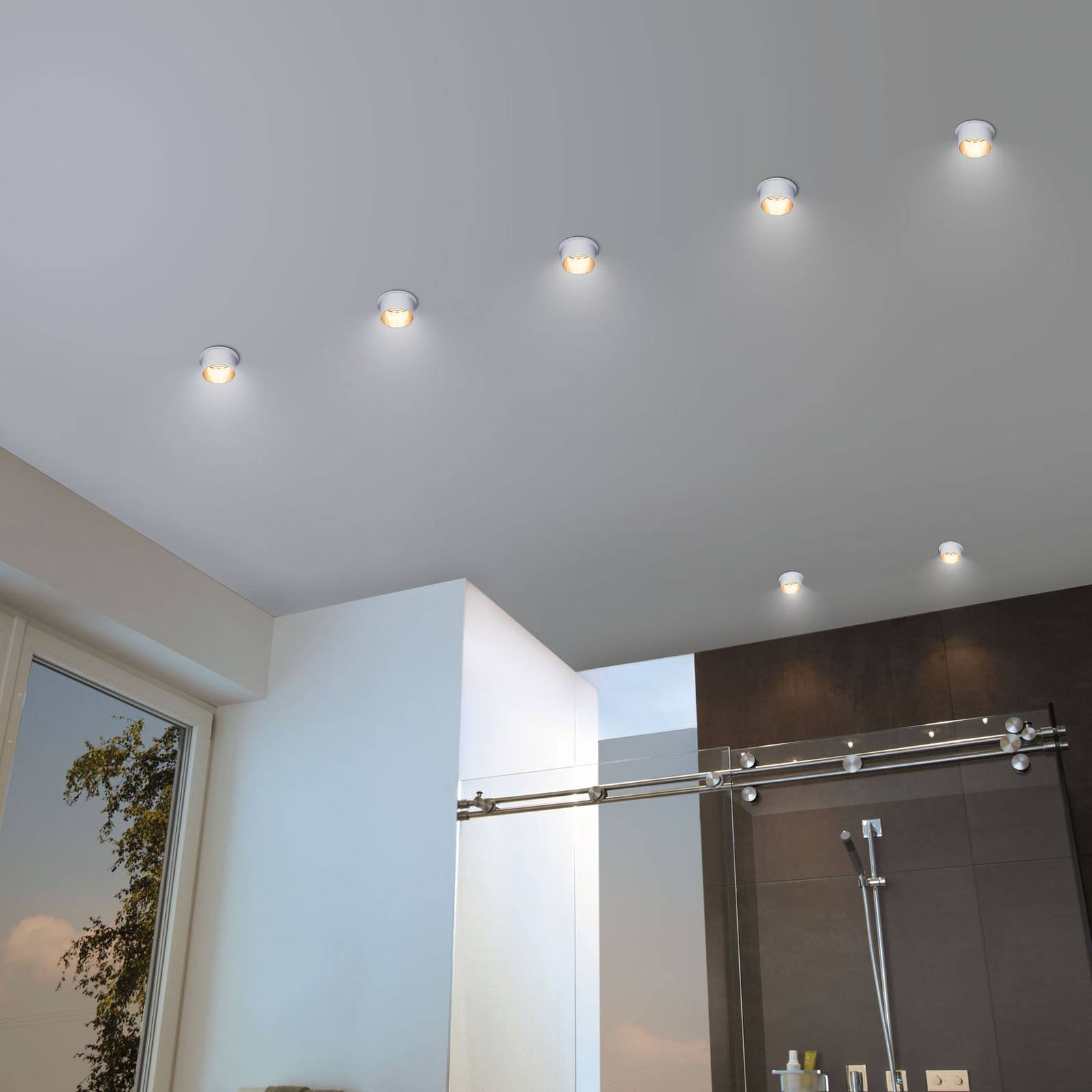 Dimbare LED inbouwarmatuur Gil met decoratieve cilinder De LED-inbouwarmatuur Gil zorgt voor decoratieve accenten in elke ruimte: ze is uitgerust met een uitstekende decoratieve cilinder met een geringe inbouwdiepte in vergelijking met de diepgeplaatste lichtpunten. De LED’s stralen warm wit licht uit voor een aangename sfeer. De lichtsterkte kan comfortabel in drie fasen worden geregeld via de conventionele lichtschakelaar: 1 x schakelaar: 100 %, 2 x schakelaar 50 % en 3 x schakelaar 25 %. Indien nodig kan de lichtbron door een specialist worden vervangen. De LED munten kunnen oneindig aan elkaar gekoppeld worden. De inbouwspot Gil is beschermd tegen het binnendringen van spatwater met beschermingsklasse IP44 en is daarom ook geschikt voor installatie in badkamers en andere vochtige ruimtes. – Voor directe 230 V aansluiting