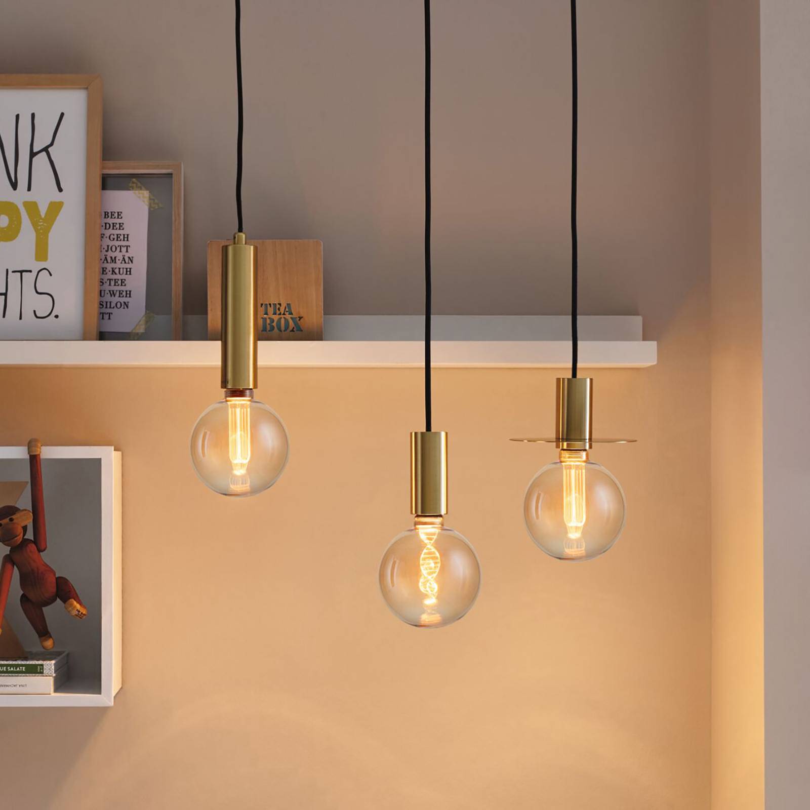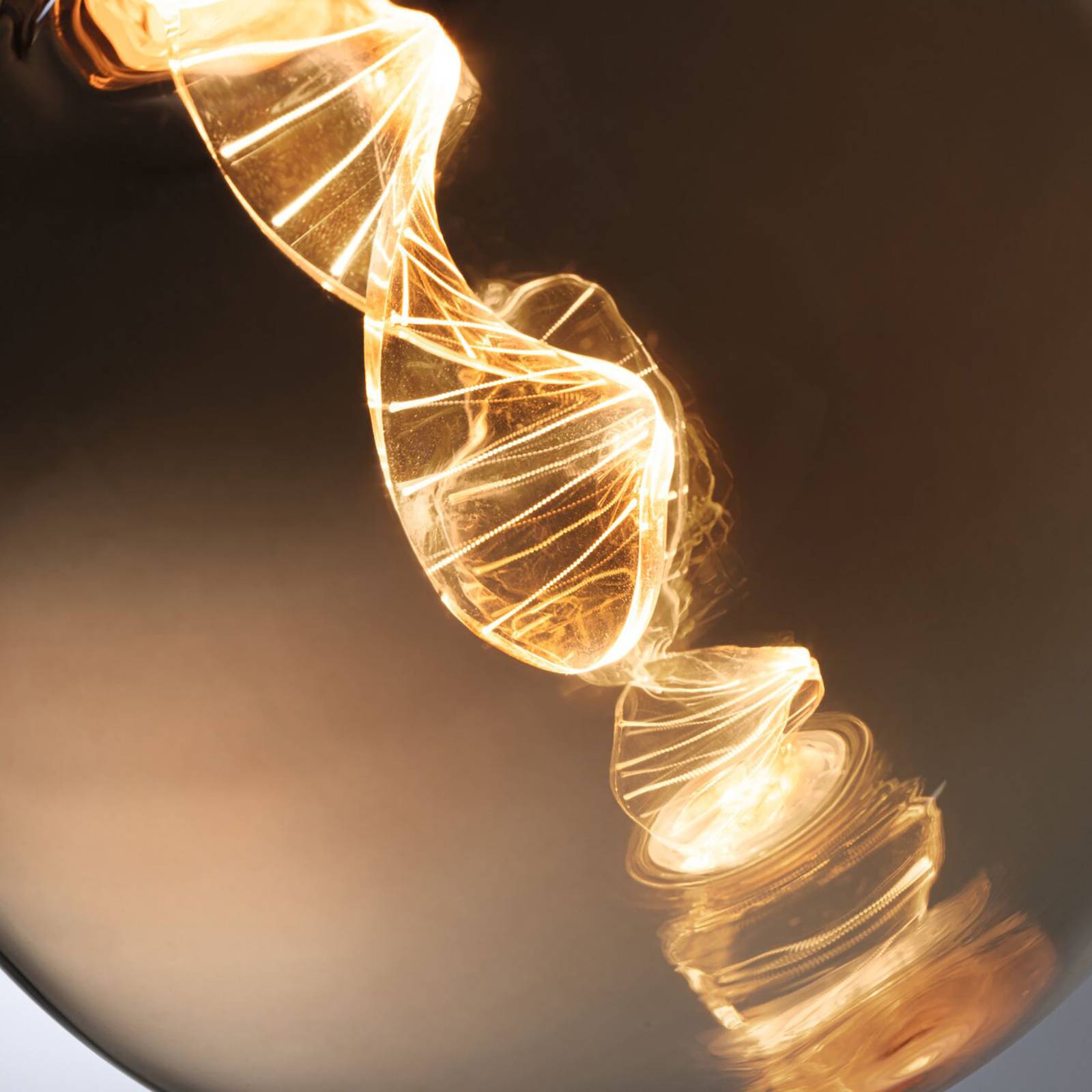 LED globe lamp E27 3,5W Filament Helix 1.800 K, goud getint glas De LED’s in deze LED globe lamp met E27 lampvoet zijn op een heel speciale manier gerangschikt. De decoratieve lamp ziet er geweldig uit in elke fitting zonder kap en geeft absoluut niet-verblindend en zeer gezellig licht dankzij de fijne lasergravure, perfect als decoratieve lamp in de woonkamer. Een deel van het licht wordt direct naar beneden uitgestraald via de verlichte ring aan de onderkant van de lamp – Warm goudkleurig licht 1.800 K – Alleen geschikt voor decoratieve verlichting, niet voor algemene verlichting
