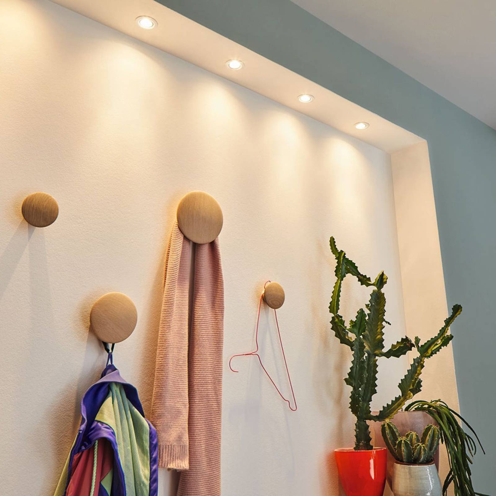 LED-inbouwarmatuur Nova mini Plus 2.700 K, draaibaar en met EasyDim-functie De LED-inbouwarmatuur Nova mini Plus biedt door haar gereduceerde afmetingen volledig nieuwe gebruiksmogelijkheden. Dankzij de EasyDim-functie kan hij worden gedimd met een standaard lichtschakelaar en is hij ideaal voor serres, spotverlichting, balie- en balkonbekleding en vele andere toepassingen. De schijnwerper is veranderlijk, vlak en oneindig koppelbaar. – Set bestaat uit een spot met LED-module voor 230V directe aansluiting – zeer vlak, installatie mogelijk voor spouwdieptes van 30 tot 35 mm – Zwenkbereik 15 – Stralingshoek 38°