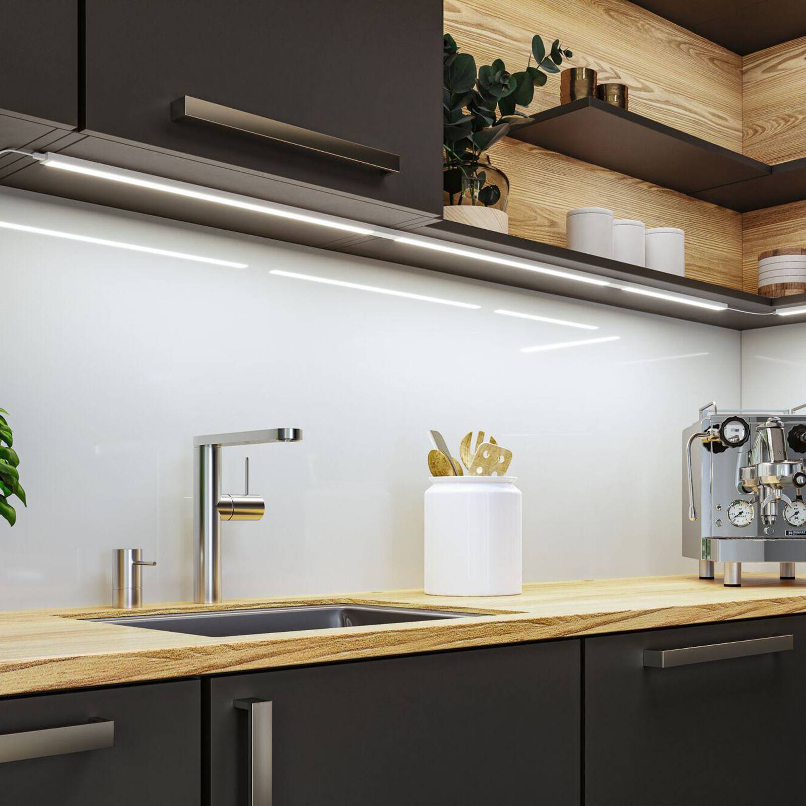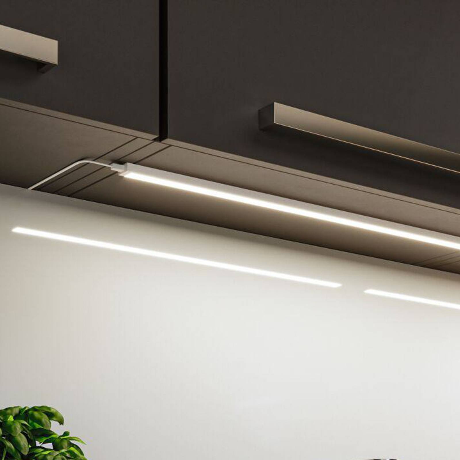 Hedendaagse keukenverlichting – LED meubelverlichting Inline, uitbreidingsset met twee warmwitte armaturen De LED meubelverlichting Inline is ontworpen voor de functionele verlichting van keukenwerkbladen. Ze bestaat uit een slank aluminium profiel en een diffuser met gemakkelijk te reinigen oppervlakken en bevat warmwitte LED’s – uitbreidingsset met twee lampen, aansluitkabel, montagemateriaal – ontworpen als aanvulling op een startset (tot een maximaal totaal vermogen van 24 W) – zonder voedingseenheid, zonder schakelaar – bediening alleen mogelijk in combinatie met een Inline startset!
