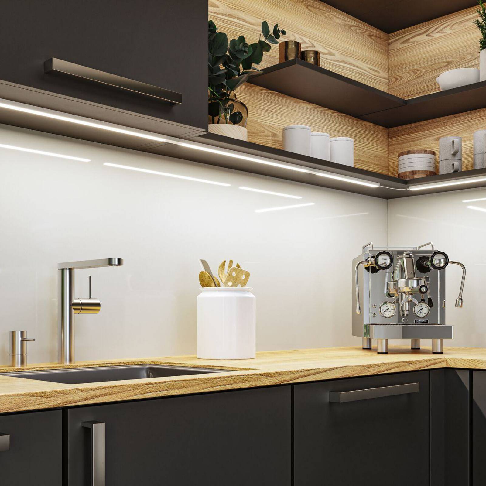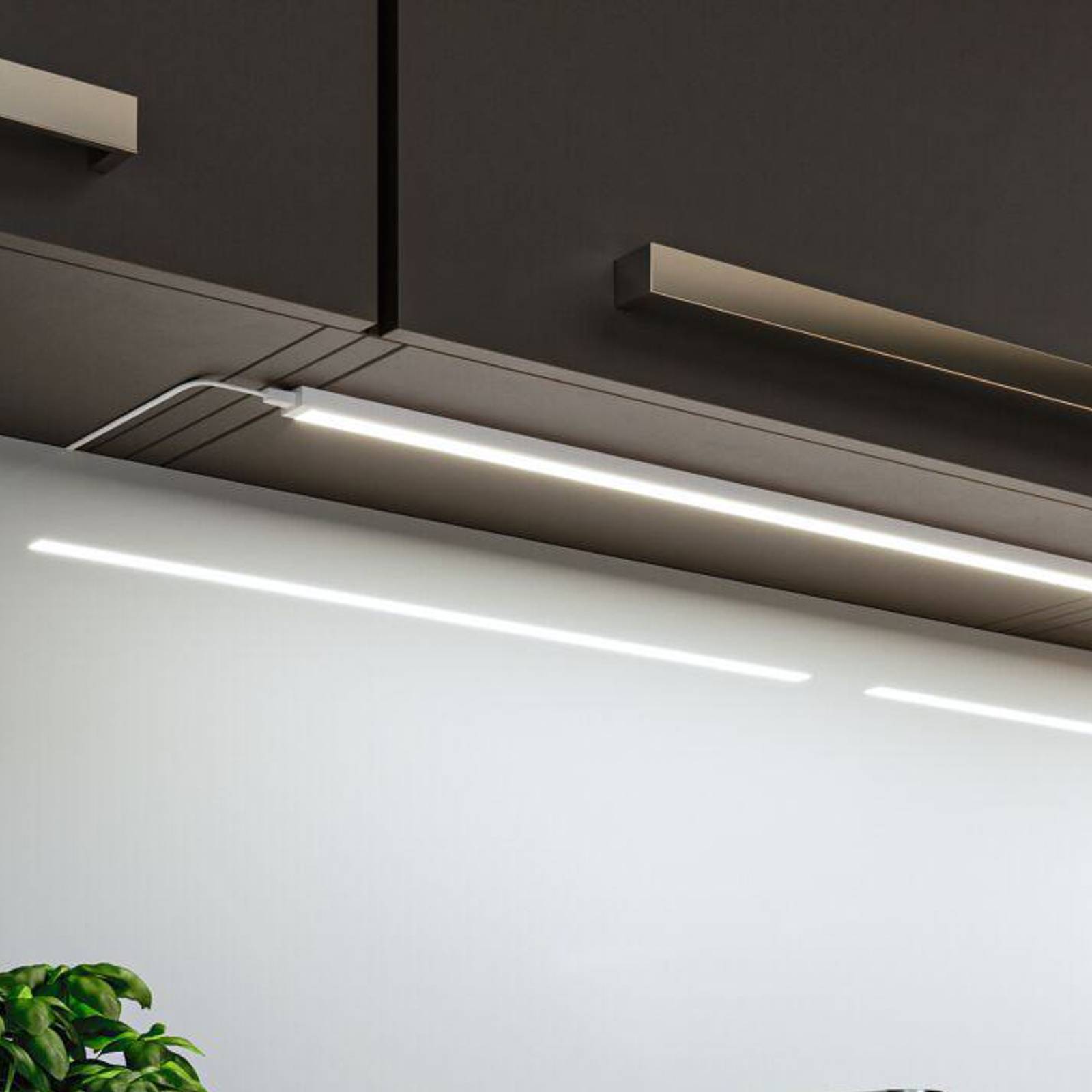 Eigentijdse keukenverlichting met gebarenbediening – Inline LED onderkastverlichting, startset met twee warmwitte armaturen De Inline LED meubelverlichting is ontworpen voor de functionele verlichting van keukenwerkbladen. Ze bestaat uit een slank aluminium profiel en een diffuser met gemakkelijk te reinigen oppervlakken en bevat warmwitte LED’s. Voor de bediening is een PIR-sensor geïntegreerd, waardoor aanraakvrije bediening mogelijk is – praktisch en hygiënisch. Schakelen gebeurt met een veegbeweging, inline dimmen is mogelijk door de hand voor de sensor te houden – Startset met twee armaturen, aansluitkabel met plug-in voedingseenheid, aansluitkabel, montagemateriaal – Kan worden aangevuld met uitbreidingsset (tot een maximaal totaal vermogen van 24 W) – De PIR-sensor op het eerste armatuur wordt gebruikt om alle andere aangesloten armaturen samen aan te sturen – Geheugenfunctie slaat de dimmerinstelling op