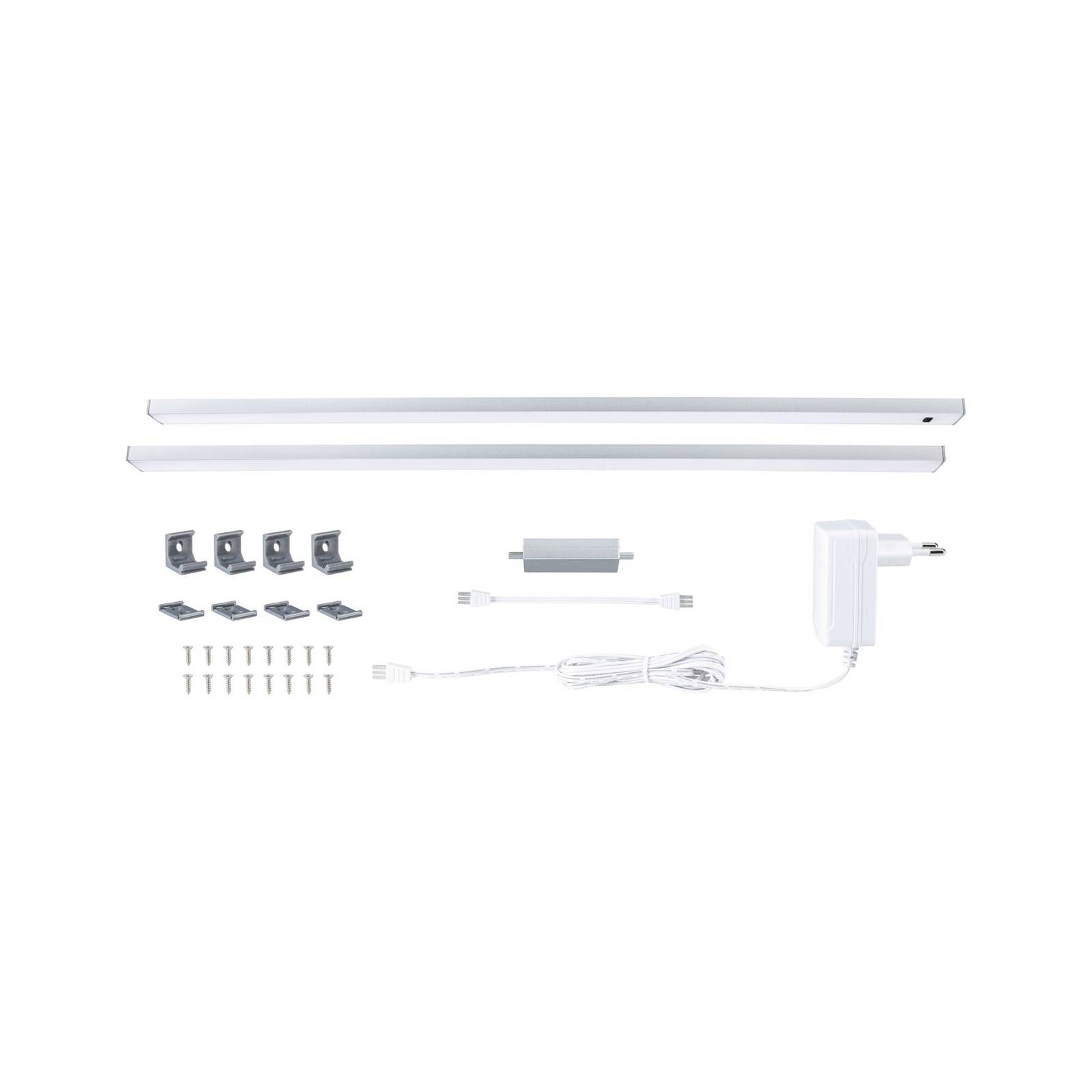 Eigentijdse keukenverlichting met gebarenbediening – Inline LED onderkastverlichting, startset met twee warmwitte armaturen De Inline LED meubelverlichting is ontworpen voor de functionele verlichting van keukenwerkbladen. Ze bestaat uit een slank aluminium profiel en een diffuser met gemakkelijk te reinigen oppervlakken en bevat warmwitte LED’s. Voor de bediening is een PIR-sensor geïntegreerd, waardoor aanraakvrije bediening mogelijk is – praktisch en hygiënisch. Schakelen gebeurt met een veegbeweging, inline dimmen is mogelijk door de hand voor de sensor te houden – Startset met twee armaturen, aansluitkabel met plug-in voedingseenheid, aansluitkabel, montagemateriaal – Kan worden aangevuld met uitbreidingsset (tot een maximaal totaal vermogen van 24 W) – De PIR-sensor op het eerste armatuur wordt gebruikt om alle andere aangesloten armaturen samen aan te sturen – Geheugenfunctie slaat de dimmerinstelling op