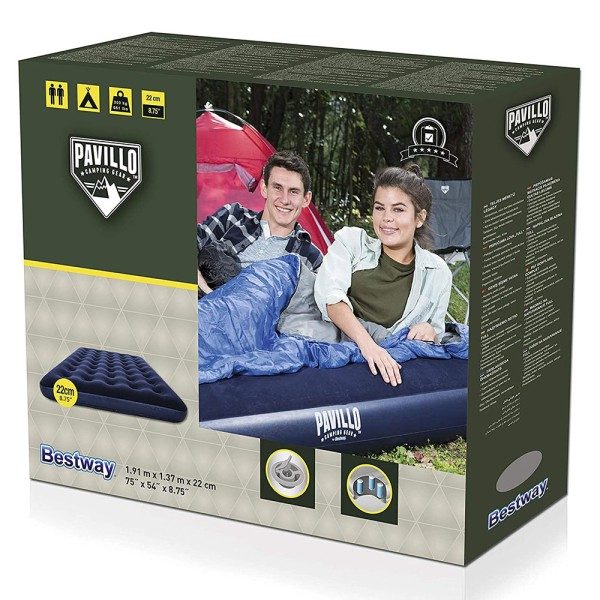 Dit simpele maar zeer gebruiksvriendelijke luchtbed twin van Bestway is bekwaam voor 2 personen. De luchtbedden van Bestway staan bekend om hoge kwaliteit en de lange levensduur. Het Pavillo luchtbed is bruikbaar als campingmatras en is waterbestendig. Het luchtbed wordt veel ingezet op campings maar hiernaast ontzettend betrouwbaar voor logeerpartijen. Het luchtbed is in zeer korte tijdsduur opblaasbaar waardoor je niet lang bezig bent met het voorbereiden van het matras. Het luchtbed kan worden opgeblazen met een voetpomp of double action pomp. De ligzijde van het luchtbed is ontwikkeld van huidvriendelijk flocked/velours equipage en heeft een uitzonderlijke inrichting voor additionele lig/slaapcomfort.