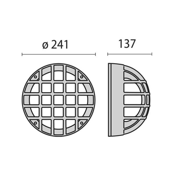 Ronde buitenwandlamp EKO+21/G met roosterafdekking De Eko+21/G buitenwandlamp ziet eruit als een patrijspoort, die beschermd is en bedekt met een rooster. De ronde vorm zorgt voor zachte overgangen en haalt de hardheid uit het heldere, rechte raster, dat qua vorm in absoluut contrast staat met het armatuur. Behuizing, decoratieve ring en opening zijn gemaakt van gegoten aluminium, de ring is verbonden met het rooster. De diffuser zelf is gemaakt van gematteerd, geperst glas en zorgt voor een niet-verblindende lichtuitstraling. De wandlamp heeft ook een parabolische reflector. Binnenin bevindt zich een E27-contactdoos die ook kan worden uitgerust met energiezuinige en duurzame LED-lampen. (Zie accessoires, lampen niet inbegrepen). – Beschermingsklasse IP66 – Lichtverdeling: symmetrische, extra brede diffusoroptiek – Slagvastheid: IK10 – niet geschikt voor doorvoerbedrading – buitenste schroeven van roestvrij staal – Omgevingstemperatuur: -30 °C tot +25 °C