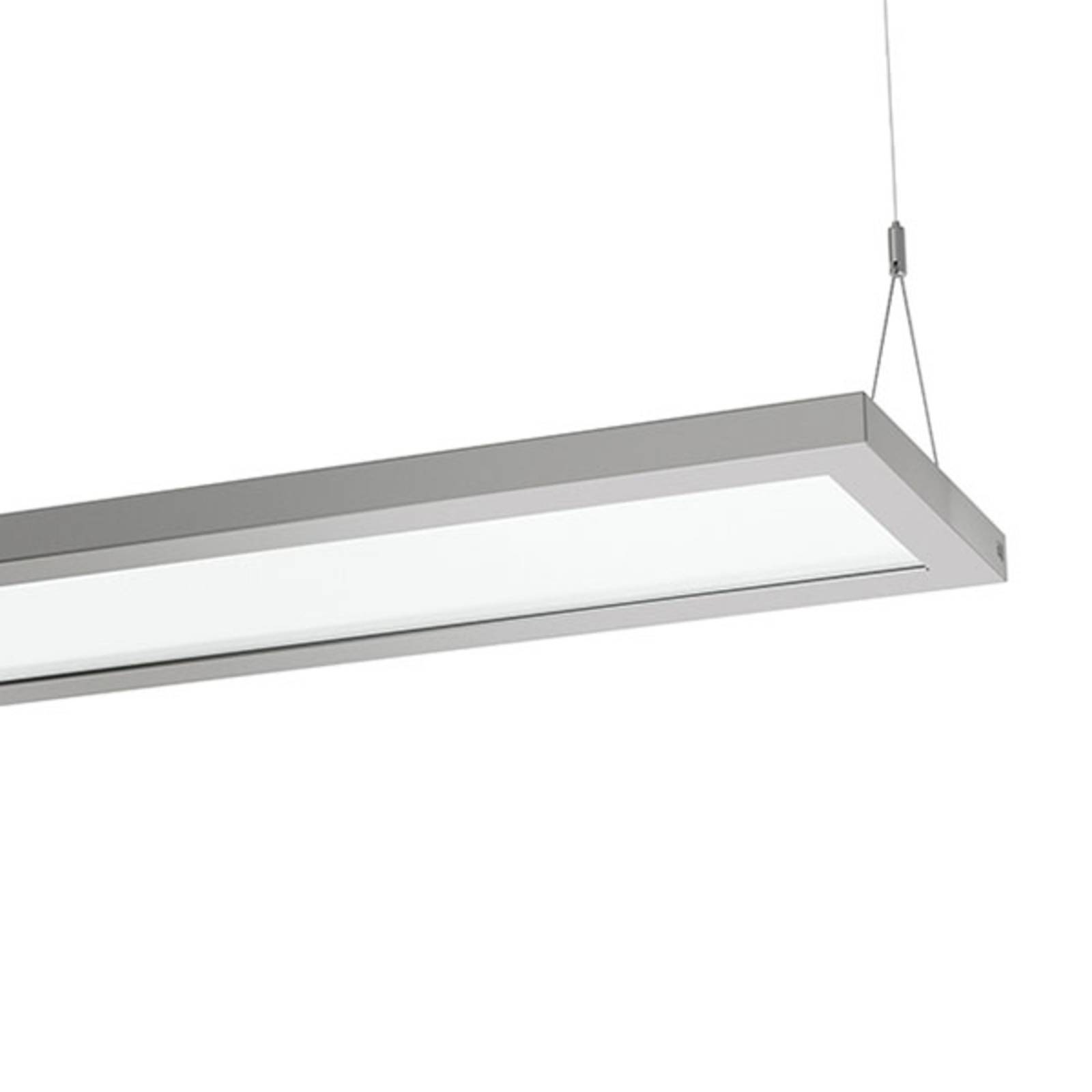Rechthoekige LED hanglamp SL629PL – effectieve kantoorverlichting Deze pendelarmatuur richt zich op functionaliteit door zijn eenvoudige uitstraling met een grijs, rechthoekig frame van gegoten aluminium en plaatstaal en een vlakke, witte diffusor. De SL629 is uitgerust met LED’s met een hoge lichtintensiteit, waarvan het licht over een groot oppervlak wordt uitgestraald voor indirecte verlichting naar boven en direct op het onderliggende werkgebied. Dankzij het gelijkmatige en verblindingsvrije lichteffect van een prismatische afdekking volgens de norm EN 12464-1 is deze ook geschikt voor gebruik boven de VDU-werkplekken. – Kleurtolerantie MacAdam: ≤ 3 SDCM – homogene lichtverdeling over het gehele lichtuitstralingsgebied dankzij de LED-zijlichttechniek – LED-levensduur: L80B10 – 50.000 h – Lichtverdeling: direct en indirect, symmetrisch, 41° / 52 – Slagvastheid: IK05