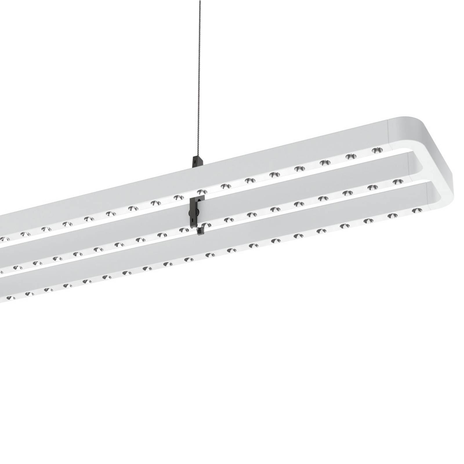 Voor directe en indirecte kantoorverlichting – LED-pendelarmatuur Small Line met daglicht- en aanwezigheidssensor De LED-pendelarmatuur Small Line bestaat uit drie onderling verbonden smalle staven van geëxtrudeerd aluminiumprofiel, die het armatuur een lichtkarakter geven. De stroomvoorziening via de ophangkabels draagt hier ook aan bij, waardoor aparte kabels niet nodig zijn. Om een bijzonder effectieve lichtemissie te bereiken, zijn de LED’s gepositioneerd in zeer specifieke bolvormige facetgeslepen reflectoren van ultrapuur aluminium. Deze zijn aan de boven- en onderzijde van de drie parallelle staven gemonteerd. Om ervoor te zorgen dat de verlichting voldoet aan de eisen, is Small Line uitgerust met een daglichtsensor en een bewegingsmelder. Hiermee wordt de lichtopbrengst aangepast aan de omgevingshelderheid en wordt de armatuur alleen ingeschakeld als er mensen aanwezig zijn. – Kleurtolerantie MacAdam: ≤ 3 SDCM – Verblindingsbescherming volgens DIN EN 12464-1 – LED-levensduur: L80B10 – 50.000 h – Lichtverdeling: direct en indirect, symmetrisch, 37° elk – dimbaar via geïntegreerde, instelbare daglichtsensor en apart verkrijgbare afstandsbediening (zie toebehoren) – Slagvastheid: IK03