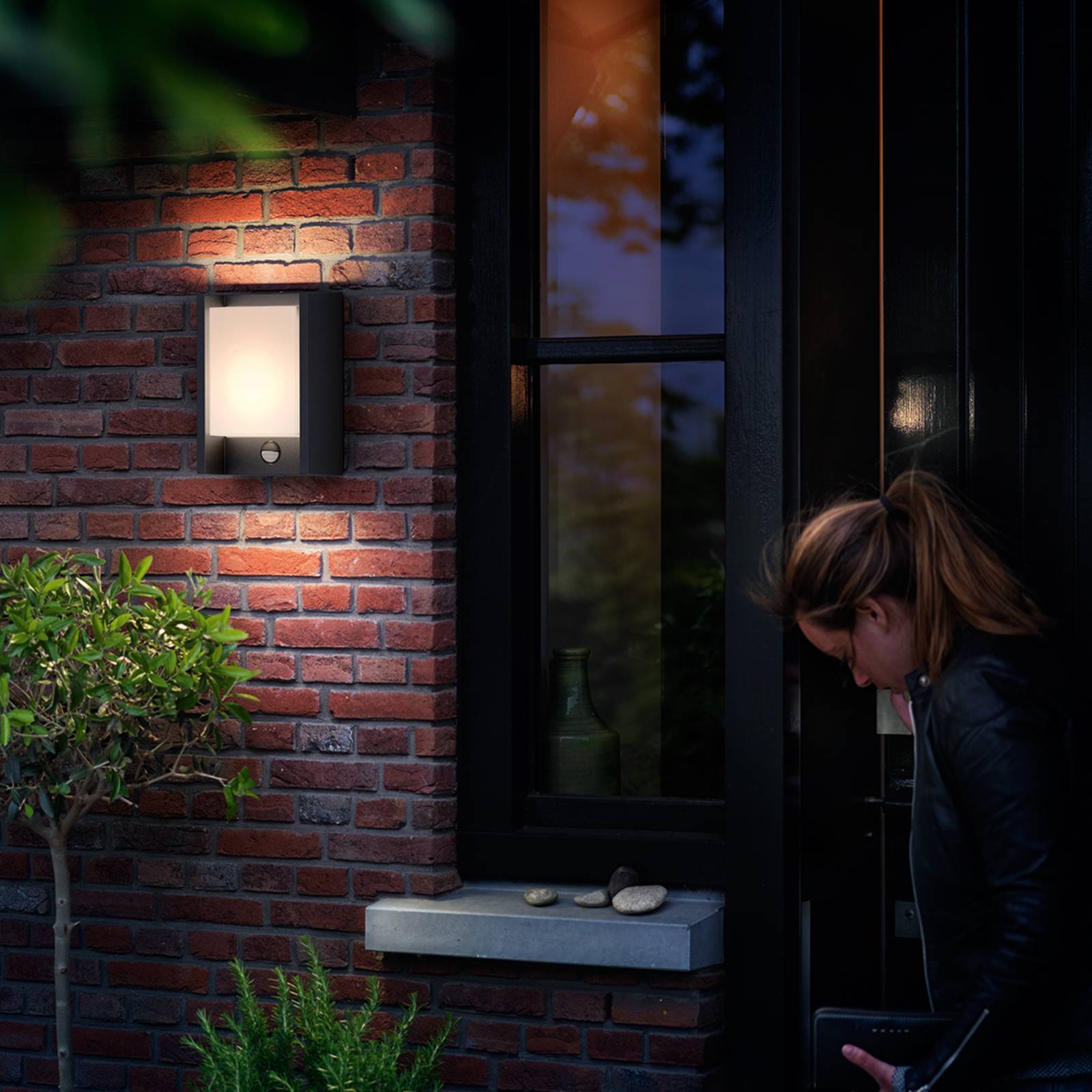 Een veilige outdoor verlichting: LED wandlamp Arbour met bewegingsmelder Met de LED outdoor wandlamp Arbour kan u zich geld besparen. Bovendien is ze met een energie-efficiëntere LED techniek uitgerust, die in vergelijking met traditionele gloeilampen ong. 80% minder stroom verbruikt, en verder beschikt ze over een geïntegreerde bewegingsmelder, die alleen dan het licht inschakelt, wanneer het nodig is. Een ander voordeel hierbij is, dat het van op afstand door de sensor gedetecteerd wordt en automatisch het licht inschakelt. Zo wordt de weg naar huis bijvoorbeeld veilig en steeds voldoende verlicht. Detectiehoek bewegingsmelder: 110° brandduur bewegingsmelder: instelbaar 5 sec. bis 12 min.