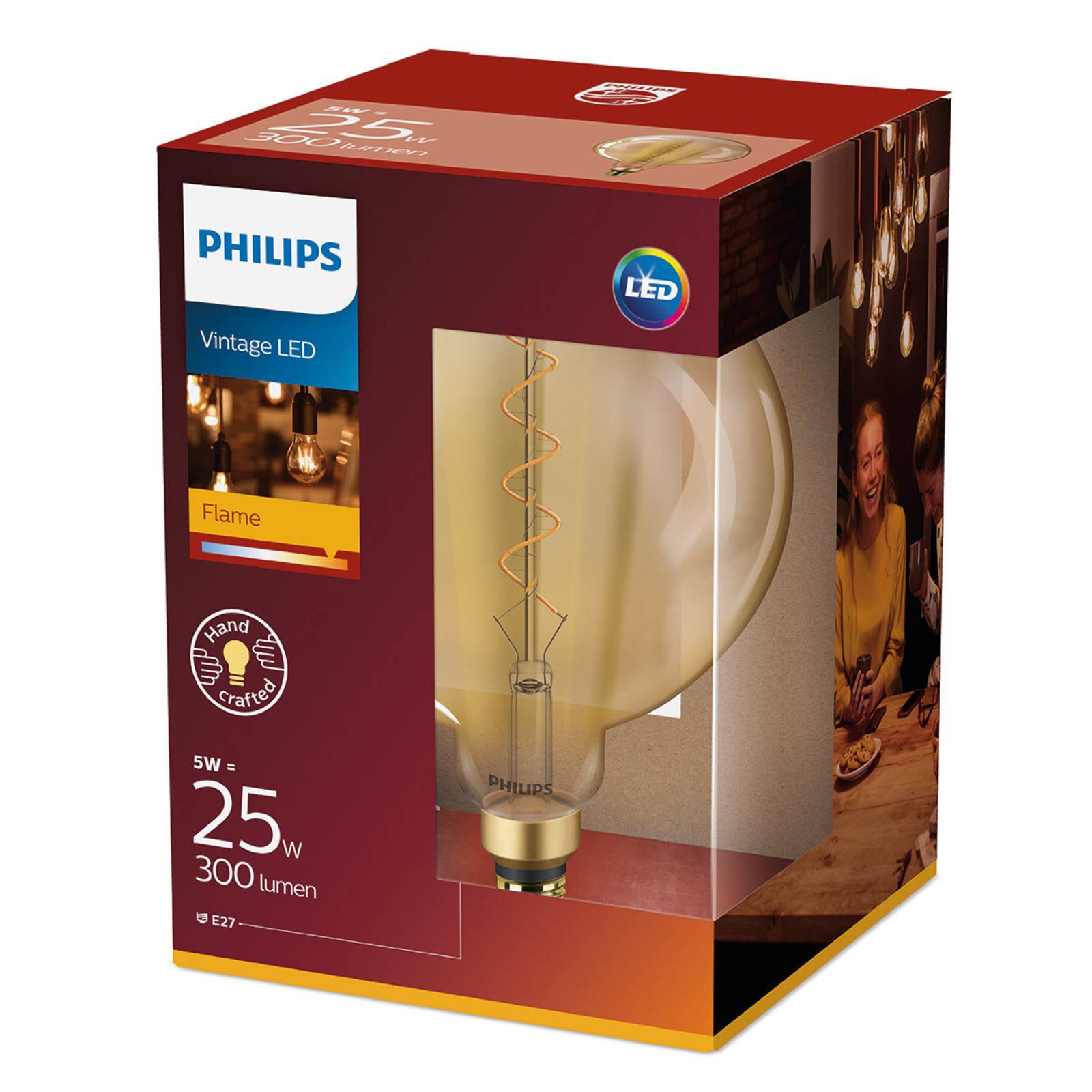 Grote LED-lamp E27 4,5 W Classic Giant van Philips, 1.800 K, goud Classic Giant – de naam verraadt het al: deze LED-lamp is een grote, even klassiek als decoratief vormgegeven LED-glaslamp die met een lichtkleur van 1.800 K voor een bijzonder warme verlichting zorgt. Het verlichtingsmiddel voor decoratieve verlichting kan worden gebruikt in de woonkamer – hier vooral in armaturen met transparante kappen, armaturen zonder kappen, trendy kooilampen of ook moderne tafellampen die uit slechts één fitting bestaan. Deze lamp voldoet aan de door Philips ontwikkelde EyeComfort-criteria. Het produceert een licht dat gemakkelijk is voor de ogen