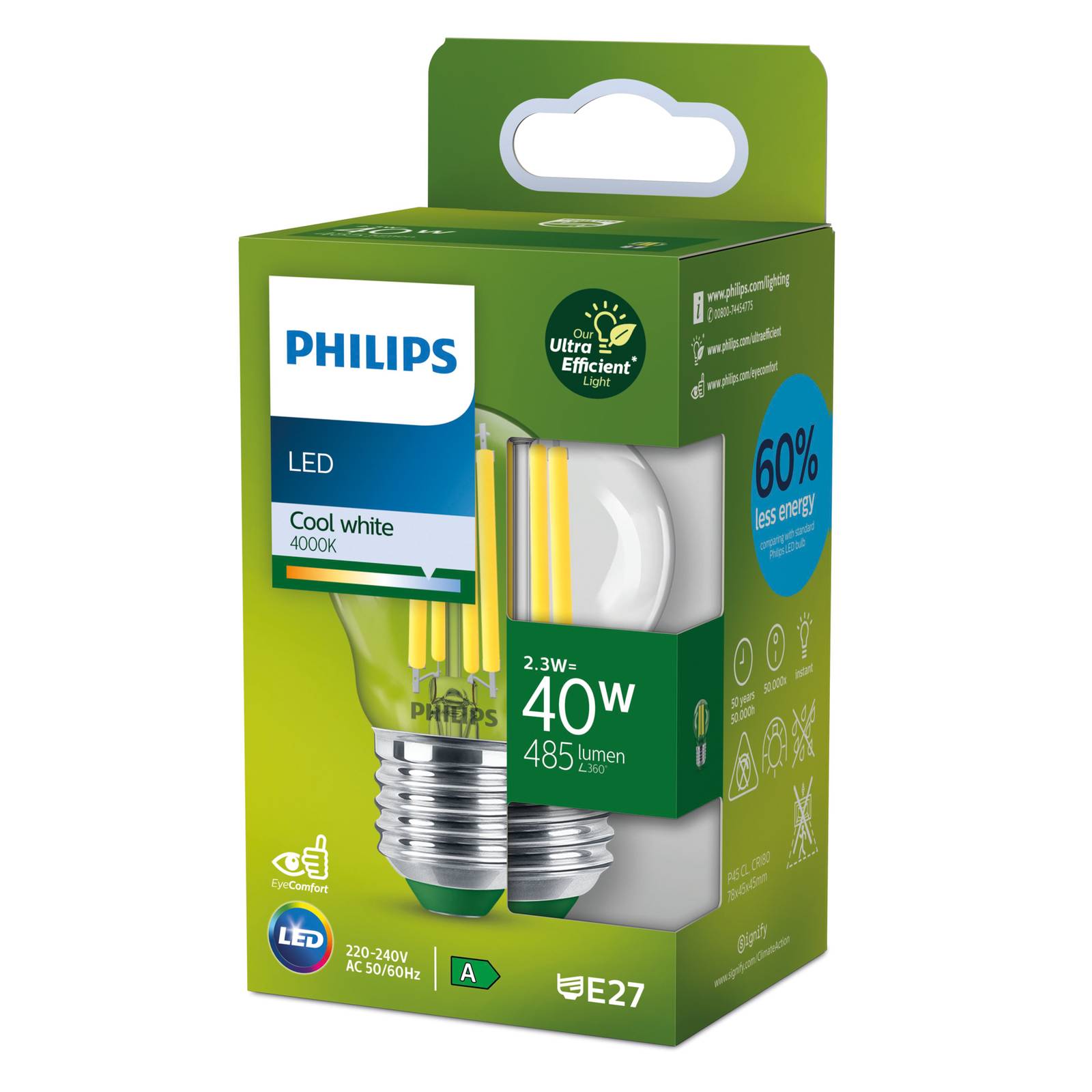 E27 LED mini-lobe lamp G45 met heldere glazen bol en 2,3 W, 485 lm, 4.000 K Deze heldere 2,3 W E27 LED gloeilamp in mini-lobe vorm met een diameter van 4,5 cm geeft universeel wit licht en dient als langdurige, energiezuinige vervanging voor conventionele 40 W gloeilampen. Niet dimbaar. Ultra-efficiënt – uitstekend lichtrendement met 210 lm/W.