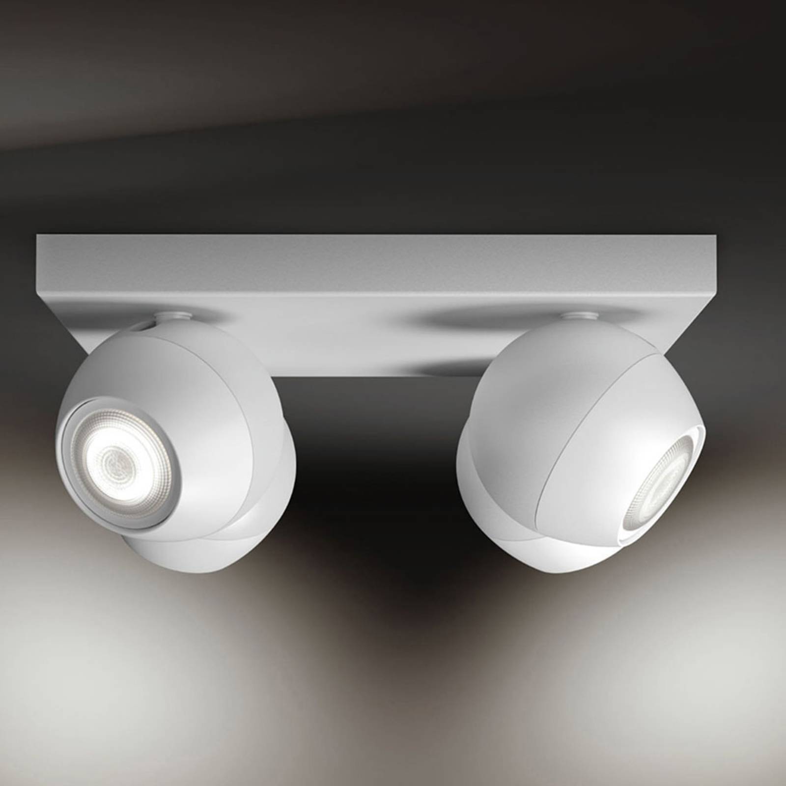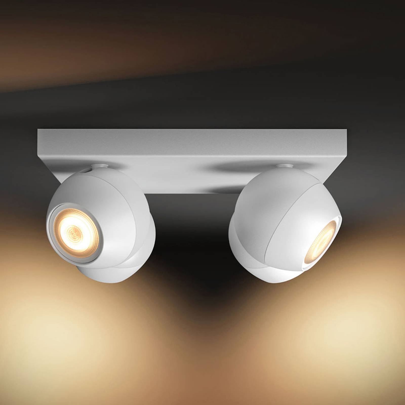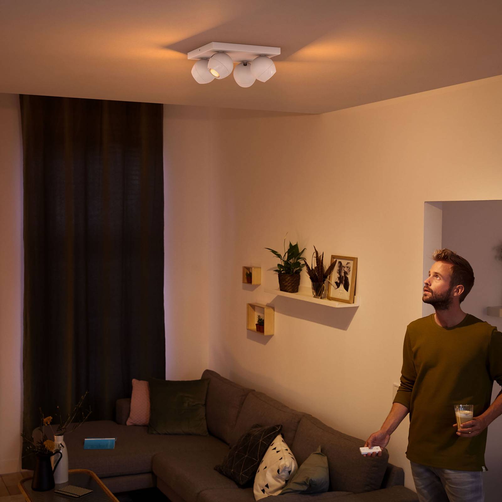 Vier-vlamige LED-plafondspot Buckram Philips Hue White Ambiance Voor flexibele algemene verlichting in een grote verscheidenheid aan ruimtes is de viervlamige Philips Hue Buckram LED-plafond-spot de ideale keuze. Uitgerust met de White Ambiance technologie, maakt het een variabele verlichting mogelijk in een breed scala aan witte lichtkleuren. Met de bij de levering inbegrepen draadloze dimschakelaar kan de verlichting comfortabel worden geselecteerd. In- en uitschakelen, het licht dimmen en het kiezen van een van de vier voorgeprogrammeerde verlichtingsrecepten is mogelijk via de dimschakelaar. De dimschakelaar is draadloos, kan aan de muur worden gemonteerd of als afstandsbediening worden gebruikt. Hij stuurt tot 10 Hue-armaturen aan, zelfs zonder brugverbinding. Met een optionele of bestaande Philips Hue Bridge kan de vierlampschijnwerper ook worden geïntegreerd in een bestaand Philips Hue-verlichtingssysteem. Het armatuur wordt in het systeem geïntegreerd via de gratis Philips Hue App en kan vervolgens via de App worden aangestuurd vanaf een smartphone of tablet. Spraakbesturing met bijvoorbeeld Siri of Alexa is nu ook mogelijk. De dimschakelaar kan nog steeds worden gebruikt als een praktische besturingseenheid binnen een Hue Smart Home systeem. Bijzondere kenmerken / compatibiliteit – Bedienbaar met de Hue-dimschakelaar (bij de levering inbegrepen) – dimbaar (via app of dimschakelaar) – compatibel met het bestaande Philips Hue systeem – bestuurbaar met bijpassende Hue app (ZigBee) en Hue Bluetooth app – compatibel met op ZigBee gebaseerde systemen zoals Innogy, Bosch, Magenta (Telekom) en Busch-Jäger – intelligente verlichtingsbesturing Optie a: ZigBee integratie via brug en router, zoals de Philips Hue Bridge (zie accessoires); dit maakt lokale of externe bediening mogelijk via Hue app en de optie van spraakbesturing via Amazon Alexa, Apple HomeKit (Siri) en Google Assistant. – intelligente lichtregeling Optie b: Directe aansturing ter plaatse via Bluetooth met gratis Hue Bluetooth-app. Als er meer dan tien lampen worden gebruikt binnen de Bluetooth-besturing, wordt het gebruik van een brug aanbevolen.