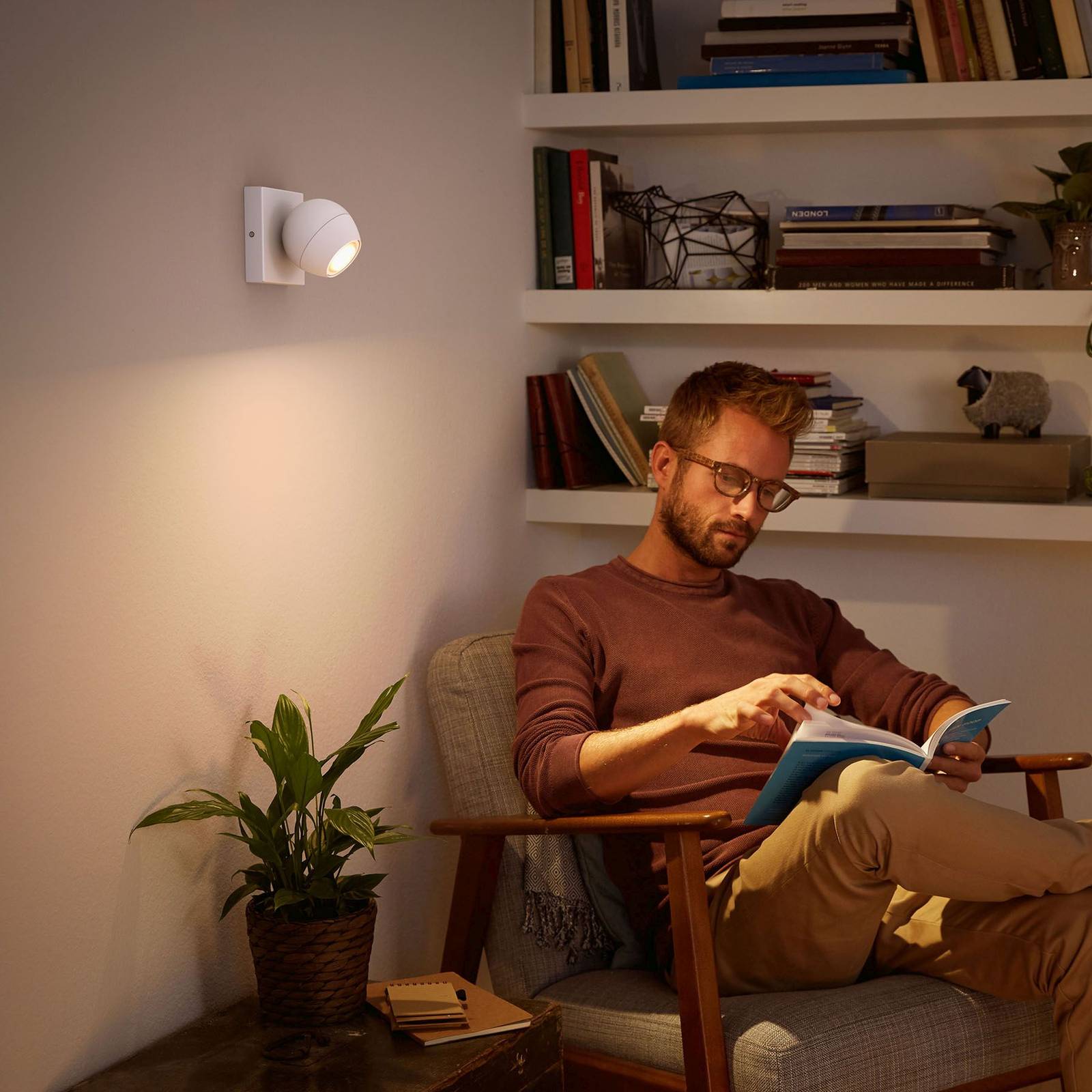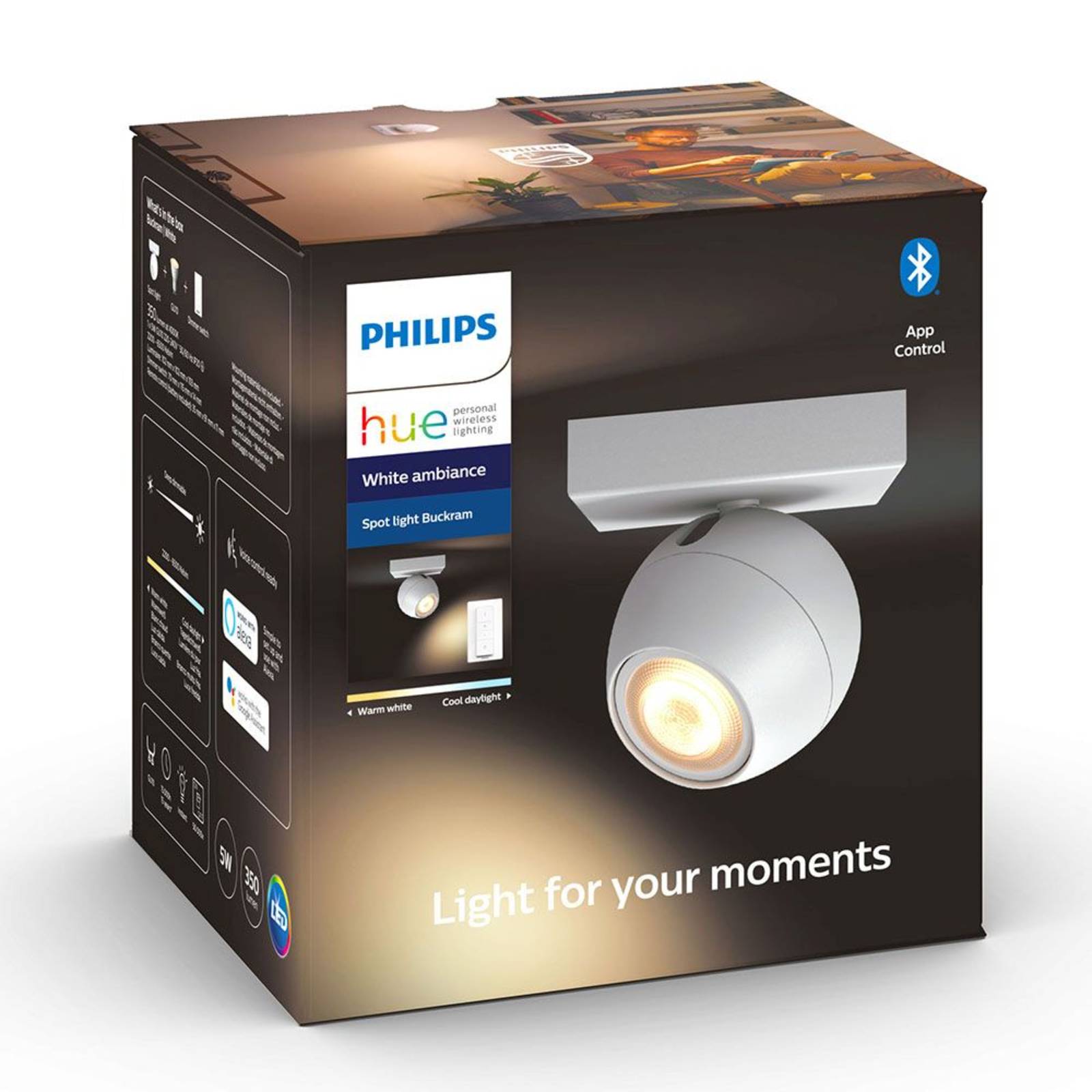 Buckram Philips Hue White Ambiance LED-plafondspot met dimschakelaar Een allround talent voor flexibele verlichting is de Philips Hue Buckram LED-plafondspot met White Ambiance-technologie. De ronde schijnwerper is draaibaar en draaibaar en wordt geleverd met een dimschakelaar. Hierdoor wordt niet alleen het licht aan- en uitgeschakeld, maar kan het ook traploos worden gedimd en kunnen vier verschillende vooringestelde verlichtingsrecepten worden ingesteld. Maximaal 10 Philips Hue lampen kunnen worden bediend via een dimschakelaar. De draadloze dimschakelaar kan aan de muur worden gemonteerd of als afstandsbediening worden gebruikt. De spot zorgt voor een witte verlichting in het bereik van warm wit (2.200 K) tot daglicht (6.500 K). Met een Philips Hue Bridge (niet inbegrepen, verkrijgbaar als accessoire) kan de single-flame spot ook worden geïntegreerd in een slim thuissysteem en, eenmaal geïntegreerd, worden bediend via de Philips Hue app met behulp van een tablet of smartphone. Als alternatief kan het ook worden bestuurd met behulp van Bluetooth en de bijbehorende Hue Bluetooth-app. Bijzondere kenmerken / compatibiliteit – Bedienbaar met de Hue-dimschakelaar (bij de levering inbegrepen) – dimbaar (via app of dimschakelaar) – bestuurbaar met bijpassende Hue app (ZigBee) en Hue Bluetooth app – compatibel met op ZigBee gebaseerde systemen zoals Innogy, Bosch, Magenta (Telekom) en Busch-Jäger – intelligente verlichtingsbesturing Optie a: ZigBee-integratie via brug en router, zoals de Philips Hue Bridge (zie accessoires); dit maakt lokale of externe bediening mogelijk via de Hue-app en de optie van spraakbesturing via Amazon Alexa, Apple HomeKit (Siri) en Google Assistant. – intelligente lichtregeling Optie b: Directe aansturing ter plaatse via Bluetooth met gratis Hue Bluetooth-app. Als er meer dan tien lampen worden gebruikt binnen de Bluetooth-besturing, wordt het gebruik van een brug aanbevolen.