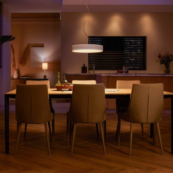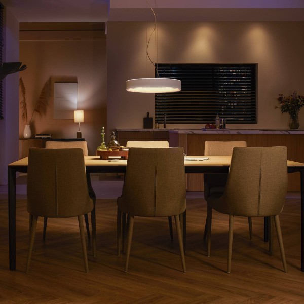 Slimme bediening – Philips Hue LED-hanglamp Enrave met bijpassende dimschakelaar De moderne Enrave LED hanglamp is een elegante lichtbron die kan worden gebruikt boven tafels in de woon- of eetkamer. Hij geeft niet alleen direct licht naar beneden, maar ook indirect licht met twee ringen die naar boven schijnen. Het kan op verschillende manieren worden gecontroleerd. Met de meegeleverde dimschakelaar kunt u de lamp in- en uitschakelen, dimmen en vooraf geïnstalleerde scènes oproepen. Meer mogelijkheden biedt de bediening met de eigen smartphone/tablet via Bluetooth, waarmee ook de lichtkleur kan worden aangepast en talrijke scènes kunnen worden gekozen. Slimme integratie voor koppeling met andere elementen en vrije configuratie, evenals het instellen van stembediening is mogelijk met de Hue Bridge. Speciale kenmerken / compatibiliteit – Bedienbaar met de Hue-dimschakelaar (bij levering inbegrepen) – dimbaar (via app, dimschakelaar of stemcommando) – compatibel met bestaand Philips Hue-systeem – bedienbaar met bijpassende Hue app (in combinatie met Hue Bridge) en Hue Bluetooth app (direct met smartphone/tablet) – compatibel met andere ZigBee-gebaseerde systemen, zoals Innogy, Bosch, Magenta (Telekom) en Busch-Jäger – intelligente verlichtingsbediening optie a: ZigBee-integratie via bridge en router, zoals de Philips Hue Bridge (zie accessoires); dit maakt bediening ter plaatse of onderweg mogelijk via de Hue-app en de optie van stembediening via Amazon Alexa, Apple HomeKit (Siri) en Google Assistant. – slimme verlichtingsbediening optie b: Directe bediening ter plaatse via Bluetooth met gratis Hue Bluetooth app. Bij gebruik van meer dan tien lampen binnen de Bluetooth-regeling wordt het gebruik van een brug aanbevolen.