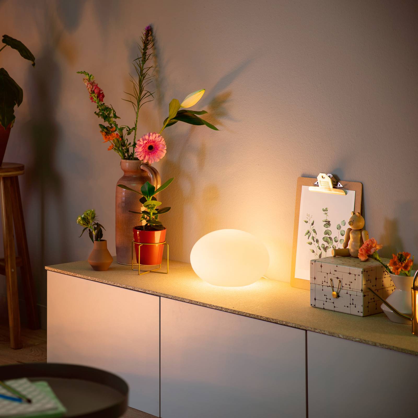 Philips Hue Flourish glazen tafellamp met slim regelbare witte en gekleurde sfeerlamp E27 Van warme, ontspannende verlichting, tot daglichtwitte werkverlichting, tot kleurrijke feestverlichting – de E27 LED lamp van de Flourish tafellamp is een meester in veelzijdigheid dankzij de White en Color Ambiance functie. Het licht wordt gelijkmatig naar alle kanten uitgestraald door de ellipsvormige glazen bol met ringpatroon. Bovendien overtuigt Flourish met flexibele bedienbaarheid. Om aan de slag te gaan, hebt u alleen een Hue-dimschakelaar nodig (zie accessoires) of de Hue Bluetooth-app op uw tablet/smartphone. Het volledige potentieel opent zich met de integratie via een ZigBee bridge en een router. Nu zijn de gratis configuratie van sequenties, groeperingen, scène-integratie, stembediening via Amazon Alexa, Google Home en Apple HomeKit, evenals afstandsbediening via Hue smartphone-app voor aanwezigheidssimulatie beschikbaar. Technische gegevens: – Kleurtemperatuur van het witte licht instelbaar van warm wit (2.000 K) tot daglicht (6.500 K) – 16 miljoen kleuren – Bluetooth-bereik binnenshuis ca. 10 m Speciale kenmerken / compatibiliteit: – Bedienbaar met de Hue-dimschakelaar (zie accessoires). – Bedienbaar met bijpassende Hue app en Hue Bluetooth app – compatibel met bestaande Philips Hue-systemen en andere ZigBee-gebaseerde systemen zoals van Innogy, Bosch, Telekom (Magenta) en Busch-Jäger – Spraakbesturing mogelijk met Amazon Alexa, Apple HomeKit (Siri) en Google Assistant – Dimbaar via app, stemcommando en dimschakelaar – intelligente verlichtingsbediening optie a: ZigBee-integratie via bridge en router, zoals de Philips Hue Bridge (zie accessoires); dit maakt bediening ter plaatse of onderweg mogelijk via de Hue-app (gratis voor Android en iOS) of ter plaatse via spraakbesturing via Amazon Alexa, Apple HomeKit (Siri) en Google Assistant. – Intelligente verlichtingsbediening optie b: Directe lokale bediening via Bluetooth met behulp van de gratis Hue Bluetooth-app; hiervoor is een smartphone of tablet nodig die gebruikmaakt van Android 7 of iOS 11 of hoger en Bluetooth Low Energy (BLE) 4.0 of hoger. Een router, WLAN of dataverbinding is niet nodig. Bij gebruik van meer dan tien lampen wordt het gebruik van een brug aanbevolen. Een lamp kan verbindingen met maximaal 15 smartphones/tablets opslaan; de individuele instellingen worden individueel toegewezen.