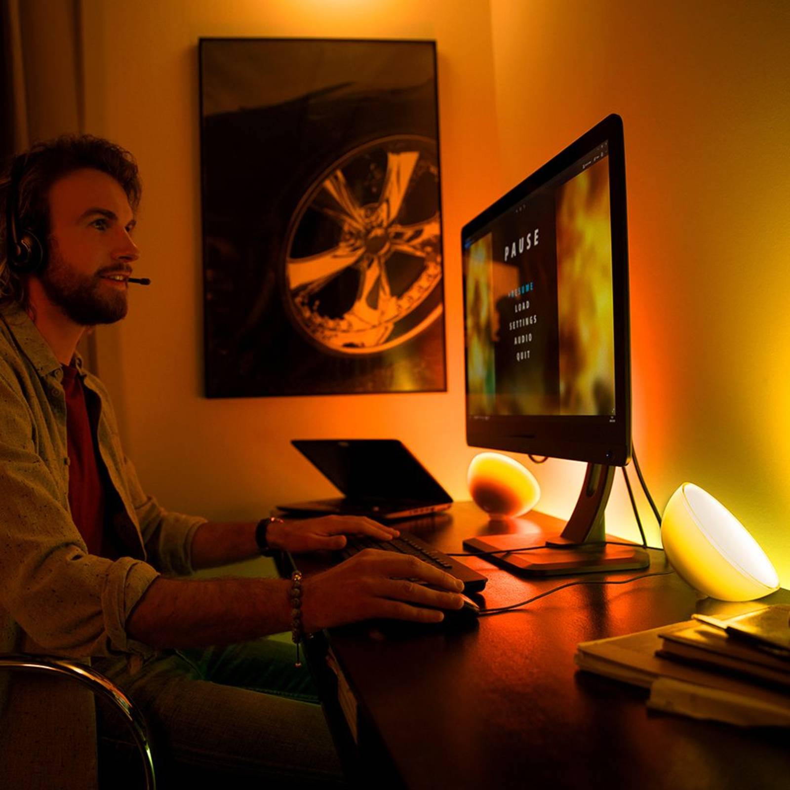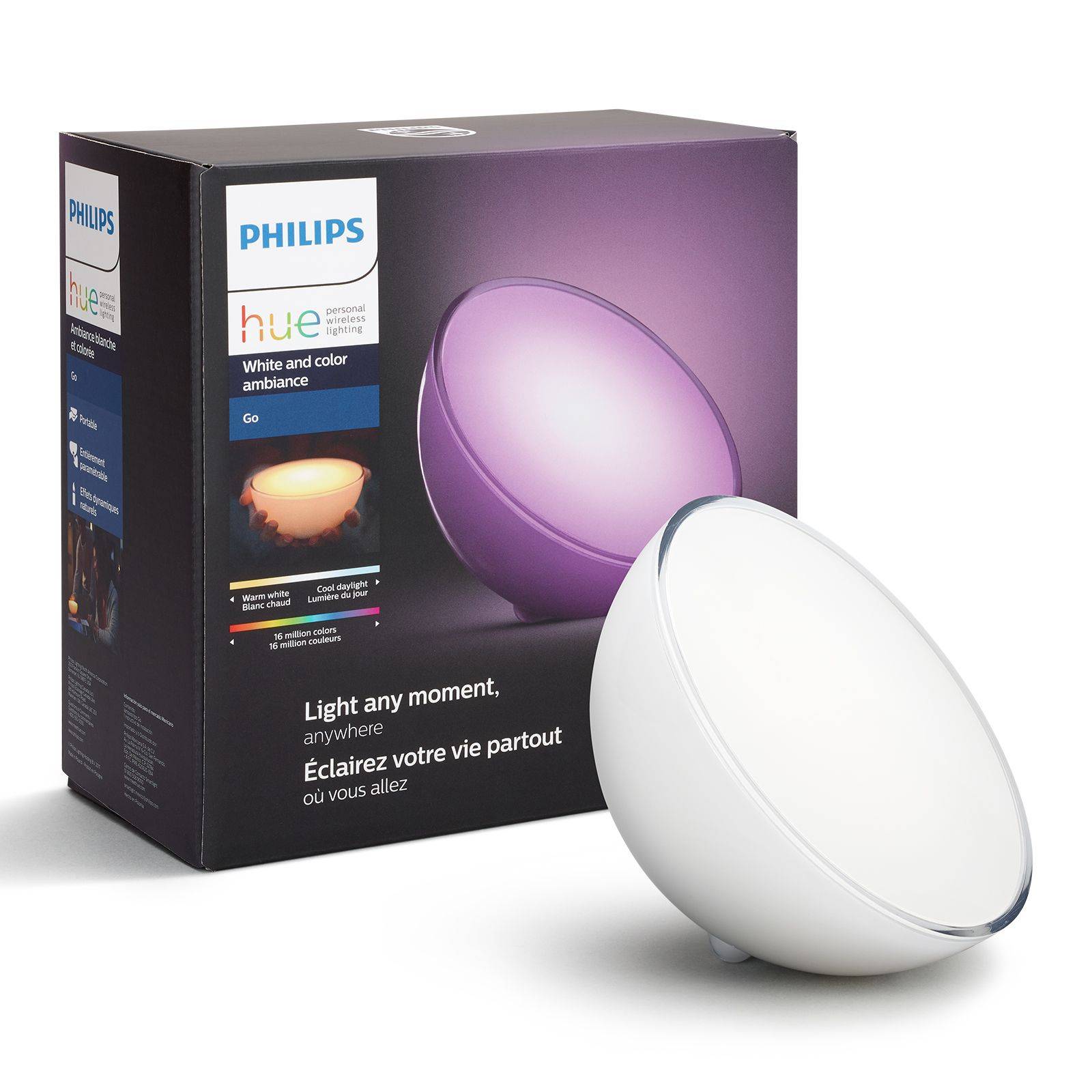 Draagbare LED-tafellamp Philips Hue Go voor Bluetooth- en Zigbee-bediening Of het nu in de slaapkamer, woonkamer of voor een feestje is – Hue Go biedt de ideale flexibele sfeerverlichting. De lamp is ontworpen als een halve bol waarvan de LED’s worden gevoed door een geïntegreerde oplaadbare batterij. Wit licht met een kleurtemperatuur van 2.000 tot 6.500 Kelvin en gekleurd licht met 16 miljoen verschillende tinten bieden ontelbare keuzemogelijkheden om de verlichting aan te passen aan de gewenste stemming. Zeven recepten – zoals “Misty Morning” – zijn al voorgeïnstalleerd. Wanneer geïntegreerd met een ZigBee bridge en een router in Philips Hue of andere smart home systemen die werken met de ZigBee standaard, kunnen kleur en helderheid naar wens worden geregeld via bijvoorbeeld de Hue smartphone app, en geactiveerd via spraakbesturing (Google Home, Amazon Alexa, Apple HomeKit). Daarnaast is er de mogelijkheid van directe Bluetooth-bediening via de Hue Bluetooth-app voor de tablet en smartphone, zodat verdere hardware achterwege kan blijven. Technische gegevens: – Kleurtemperatuur van het witte licht instelbaar van warm wit (2.000 K) tot daglicht (6.500 K) – 16 miljoen kleuren – Bluetooth-bereik binnenshuis ca. 10 m – Oplaadtijd 3 uur, bedrijfstijd 2,5 uur Speciale kenmerken / compatibiliteit: – Bedienbaar met de Hue-dimschakelaar (zie accessoires). – Bedienbaar met bijpassende Hue app en Hue Bluetooth app – compatibel met bestaande Philips Hue-systemen en andere ZigBee-gebaseerde systemen zoals van Innogy, Bosch, Telekom (Magenta) en Busch-Jäger – Spraakbesturing mogelijk met Amazon Alexa, Apple HomeKit (Siri) en Google Assistant – Dimbaar via app, stemcommando en dimschakelaar – intelligente verlichtingsbediening optie a: ZigBee-integratie via bridge en router, zoals de Philips Hue Bridge (zie accessoires); dit maakt bediening ter plaatse of onderweg mogelijk via de Hue-app (gratis voor Android en iOS) of ter plaatse via spraakbesturing via Amazon Alexa, Apple HomeKit (Siri) en Google Assistant. – Intelligente verlichtingsbediening optie b: Directe lokale bediening via Bluetooth met behulp van de gratis Hue Bluetooth-app; hiervoor is een smartphone of tablet nodig die gebruikmaakt van Android 7 of iOS 11 of hoger en Bluetooth Low Energy (BLE) 4.0 of hoger. Een router, WLAN of dataverbinding is niet nodig. Bij gebruik van meer dan tien lampen wordt het gebruik van een brug aanbevolen. Een lamp kan verbindingen met maximaal 15 smartphones/tablets opslaan; de individuele instellingen worden individueel toegewezen.