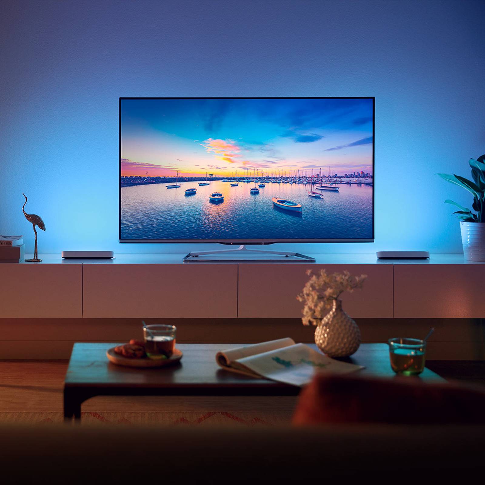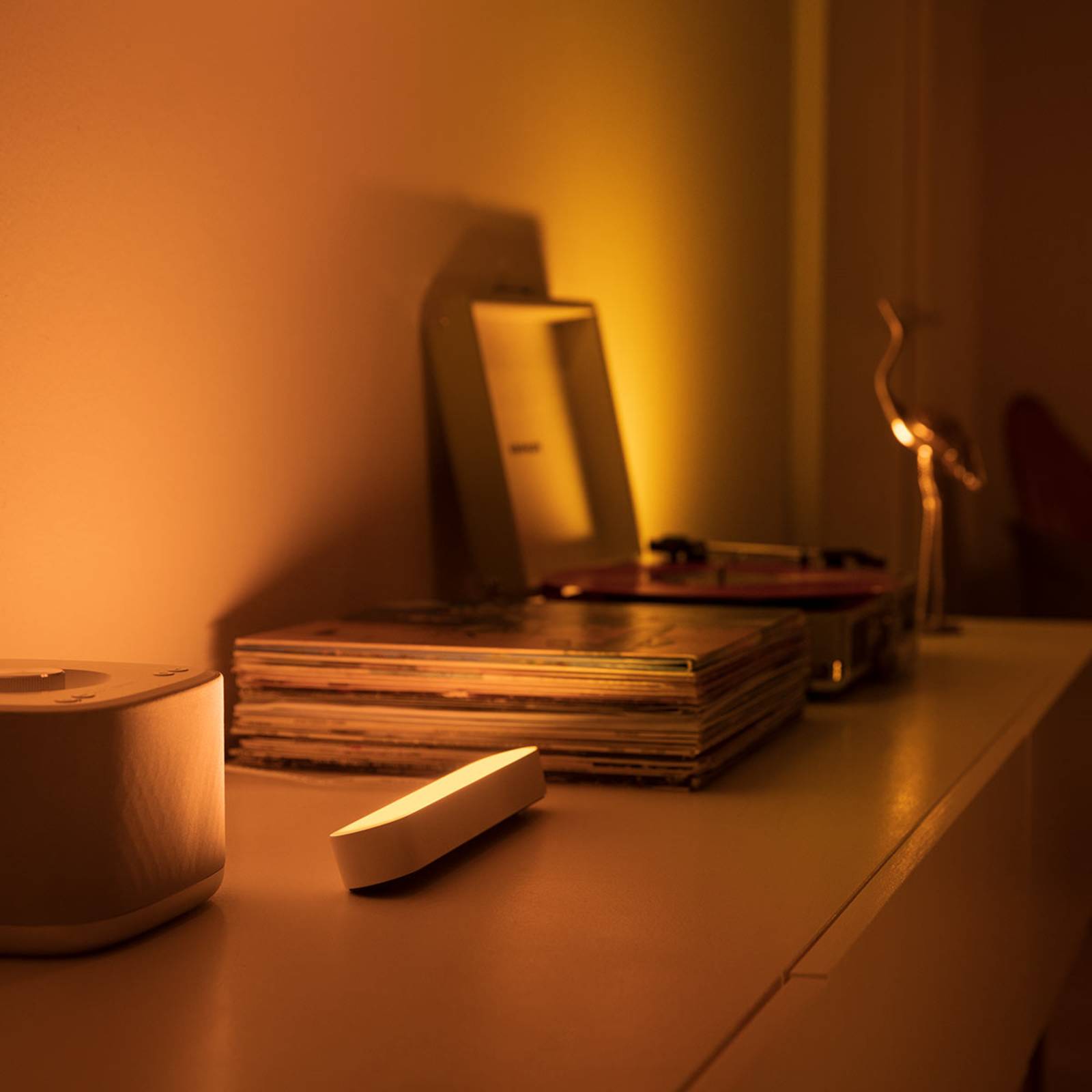 Zorgt voor een fascinerende lichtervaring – Philips Hue White and Color Ambiance Play Lightbar in duopack Met de in het duopack geleverde Philips Hue Play LED tafellamp wordt entertainment een echte belevenis. Want door haar meer dan 16 miljoen verschillende lichtkleuren overtuigt ze met een dynamische synchronisatie naar muziek, films of videogames, zodat de intensiteit en werking van de inhoud van het beeldscherm naar de volledige kamer wordt overgedragen. Hierbij zorgt de lineaire behuizing van de lamp voor een bijzonder homogene en verblindingsvrije lichtverdeling, maakt niet uit of het nu op de vloer, de wand of het plafond is. Afhankelijk van de montage kan de lamp verticaal of horizontaal worden geplaatst of gelegd maar ook rechtstreeks aan de achterkant van tv’s of pc’s worden gemonteerd. Technische gegevens/compatibiliteit: – praktisch duopack – compact ontwerp – met White & Color sfeerfunctie – perfecte synchronisatie naar muziek, films of videogames – compatibel met Philips Hue Sync. – uitbreidbaar door extra lampen en 5 m verlengkabel (zie accessoires) – incl. stroomkabel Opmerking: Voor de koppeling in uw eigen Smart-Home-systeem is de Hue-bridge nodig (zie accessoires)