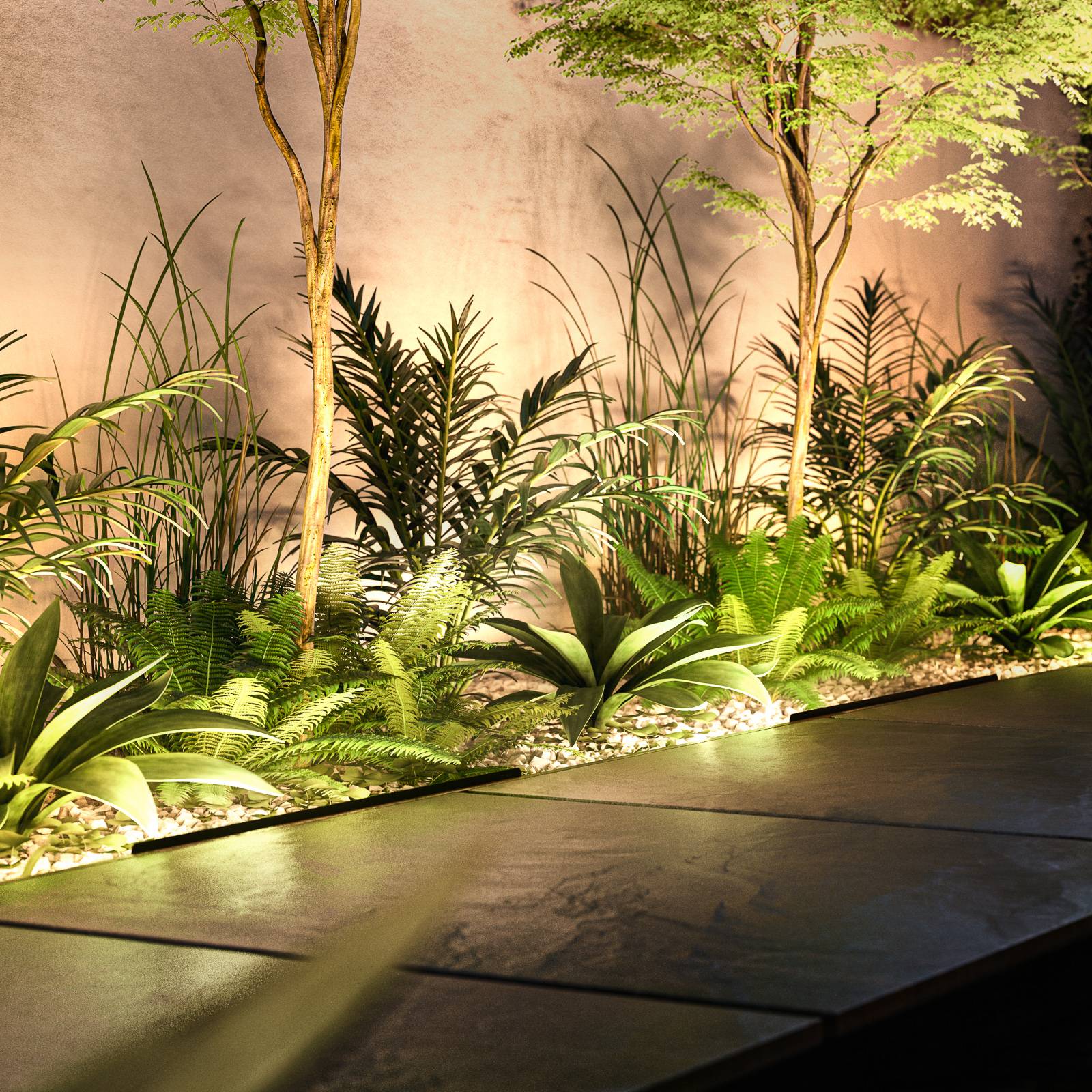 24 V LED-grondverlichtingsstrip Philips Hue White en Color Ambiance Amarant voor breedbandverlichting buitenshuis Grotere delen in de buitenruimte, zoals bomen, heggen, tuinpaviljoens of gevels, kunnen effectief worden geaccentueerd met de Philips Hue-grondlamp Amarant. Hij creëert een vlak wallwashing lichteffect naar één kant – dankzij de White en Color Ambiance technologie, naar keuze in warm wit tot daglichtwit, elke kleurtint en traploos instelbare helderheid. Om Amarant te bedienen, wordt het via een bridge geïntegreerd in Philips Hue of een ander ZigBee-gebaseerd systeem (zie accessoires). Afhankelijk van de configuratie maakt dit bediening via app, in scènes met andere slimme buitenlampen of via spraakbesturing mogelijk. Amarant wordt geleverd met een hoekprofiel waardoor de lichtstrip kan worden uitgelijnd en ondersteund op richels, en waardoor verblinding van achteren wordt voorkomen. De werking is met 24 V extra-laagspanning; geschikte voedingseenheden voor 230 V aansluiting worden niet meegeleverd en moeten via de accessoires worden besteld. Aangezien de Amarant zowel een uitgang als een ingang heeft, kunnen meerdere eenheden in serie worden aangesloten en gebruikt. Technische gegevens / compatibiliteit: – Leveringsomvang: armatuur, hoekprofiel, aansluitkabel 45 cm, T-stuk, verlengkabel 250 cm. – Bedienbaar en dimbaar via de Hue app – Warm wit (2.000 K) tot daglicht wit (6.500 K) – 16 miljoen kleuren voor indrukwekkende buitenverlichting – Compatibel met bestaand Philips Hue-systeem – Spraakbesturing mogelijk met Amazon Alexa, Apple HomeKit en Google Assistant – in een netwerk op te nemen met de bewegingsmelder Hue buitensensor (zie accessoires) – compatibel met Hue Sync – licht in harmonie met muziek – verbinding met de Hue Bridge is vereist (zie accessoires) – vereist 24 V externe voeding (zie accessoires) Opmerking: Voor een soepele werking van de Hue-buitenverlichting moet de eerste buitenlamp op max. 10 m afstand van de binnenbrug of een Hue-lamp worden geplaatst. Daarna moeten alle andere lampen op een afstand van max. 20 m worden geïnstalleerd. Maar hoe kleiner de afstand, hoe beter.
