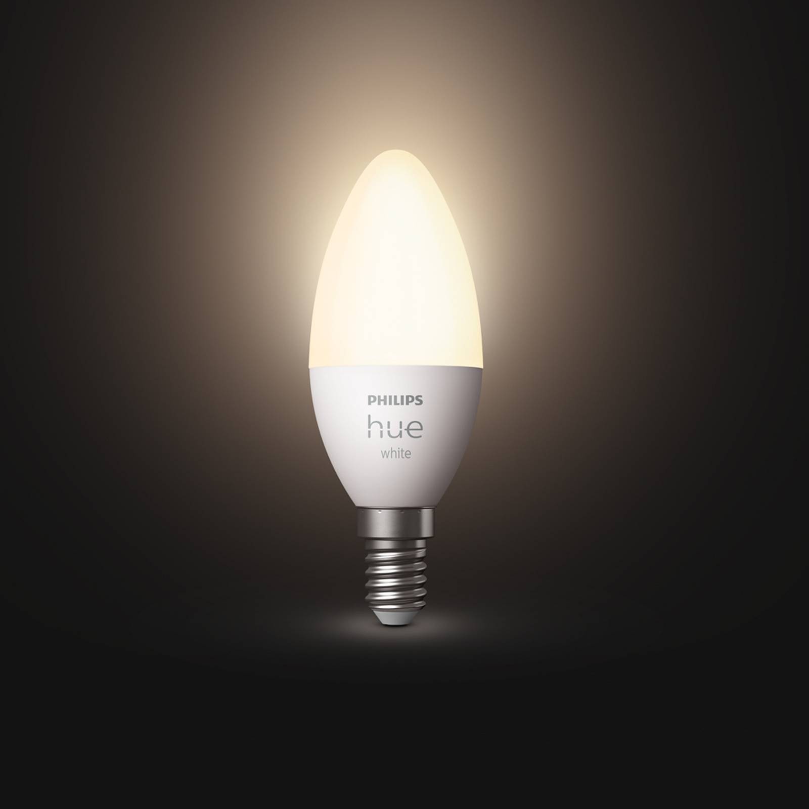 Warmwitte Philips Hue E14 LED-kaarslamp voor ZigBee- en Bluetooth-bediening Voor armaturen met een E14 fitting die moeten worden uitgerust met een slim regelbare lichtbron en worden gebruikt voor warm witte verlichting, is de Hue White LED kaarslamp de geschikte oplossing. Hij dient als vervangingslamp voor Hue-armaturen, voor de uitbreiding van bestaande Hue-kits en voor de slimme upgrade van conventionele E14-armaturen. Met de Hue-dimschakelaar (zie accessoires) of de Hue Bluetooth-app op de smartphone/tablet kan de lamp comfortabel in de kamer worden gedimd – zonder tussenliggende hardware. De integratie in een bestaand Hue- of ander Smart Home-systeem op basis van ZigBee gebeurt door middel van een bridge en router. Zo kan de kaarslamp samen met slimme armaturen of andere apparaten worden gekoppeld aan scènes, worden bediend met spraakopdrachten via Amazon Alexa, Google Home en Apple HomeKit en onderweg worden geactiveerd via de Hue smartphone-app om aanwezigheid te simuleren. Technische gegevens: – Warm wit licht (2.700 K) – Bluetooth-bereik binnenshuis ca. 10 m Speciale kenmerken / compatibiliteit: – Bedienbaar met de Hue-dimschakelaar (zie accessoires). – Bedienbaar met bijpassende Hue app en Hue Bluetooth app – compatibel met bestaande Philips Hue-systemen en andere ZigBee-gebaseerde systemen zoals van Innogy, Bosch, Telekom (Magenta) en Busch-Jäger – Spraakbesturing mogelijk met Amazon Alexa, Apple HomeKit (Siri) en Google Assistant – Dimbaar via app, stemcommando en dimschakelaar – intelligente verlichtingsbediening optie a: ZigBee-integratie via bridge en router, zoals de Philips Hue Bridge (zie accessoires); dit maakt bediening ter plaatse of onderweg mogelijk via de Hue-app (gratis voor Android en iOS) of ter plaatse via spraakbesturing via Amazon Alexa, Apple HomeKit (Siri) en Google Assistant. – Intelligente verlichtingsbediening optie b: Directe lokale bediening via Bluetooth met behulp van de gratis Hue Bluetooth-app; hiervoor is een smartphone of tablet nodig die gebruikmaakt van Android 7 of iOS 11 of hoger en Bluetooth Low Energy (BLE) 4.0 of hoger. Een router, WLAN of dataverbinding is niet nodig. Bij gebruik van meer dan tien lampen wordt het gebruik van een brug aanbevolen. Een lamp kan verbindingen met maximaal 15 smartphones/tablets opslaan; de individuele instellingen worden individueel toegewezen.
