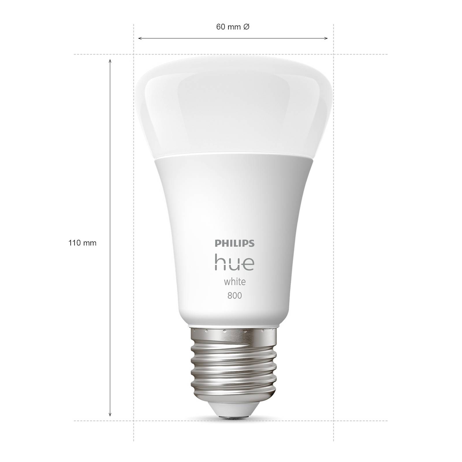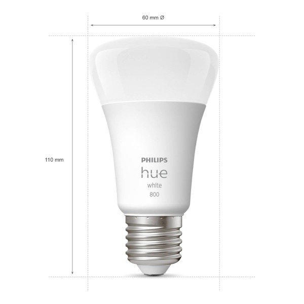 Philips Hue White E27 LED-lamp 9 W, 800 lm, in een set van 4 Om conventionele lampen te vervangen door slim bestuurbare versies, is dit praktische 4-pak E27 lampen van Philips Hue de perfecte oplossing. In een oogwenk wordt uw eigen huis slim bestuurbaar. Daartoe kunnen de lampen via Bluetooth rechtstreeks aan de smartphone/tablet worden gekoppeld of via een ZigBee bridge in een bijbehorend smart home systeem worden geïntegreerd. Zonder extra hardware is basisbediening mogelijk via de Hue-dimschakelaar, die verkrijgbaar is als accessoire. Technische gegevens: – Set van 4 – Warm wit licht (2.700 K) – Bluetooth-bereik binnenshuis ca. 10 m Speciale kenmerken / compatibiliteit: – Bedienbaar met de Hue-dimschakelaar (zie accessoires). – Bedienbaar met bijpassende Hue app en Hue Bluetooth app – compatibel met bestaande Philips Hue-systemen en andere ZigBee-gebaseerde systemen zoals van Innogy, Bosch, Telekom (Magenta) en Busch-Jäger – Spraakbesturing mogelijk met Amazon Alexa, Apple HomeKit (Siri) en Google Assistant – Dimbaar via app, stemcommando en dimschakelaar – intelligente verlichtingsbediening optie a: ZigBee-integratie via bridge en router, zoals de Philips Hue Bridge (zie accessoires); dit maakt bediening ter plaatse of onderweg mogelijk (internetverbinding vereist) via de Hue-app (gratis voor Android en iOS) of ter plaatse via spraakbesturing met Amazon Alexa, Apple HomeKit (Siri) en Google Assistant. – Intelligente verlichtingsbediening optie b: Directe lokale bediening via Bluetooth met behulp van de gratis Hue Bluetooth-app; hiervoor is een smartphone of tablet nodig die gebruikmaakt van Android 7 of iOS 11 of hoger en Bluetooth Low Energy (BLE) 4.0 of hoger. Een router, WLAN of dataverbinding is niet nodig. Bij gebruik van meer dan tien lampen wordt het gebruik van een brug aanbevolen. Een lamp kan verbindingen met maximaal 15 smartphones/tablets opslaan; de individuele instellingen worden individueel toegewezen.
