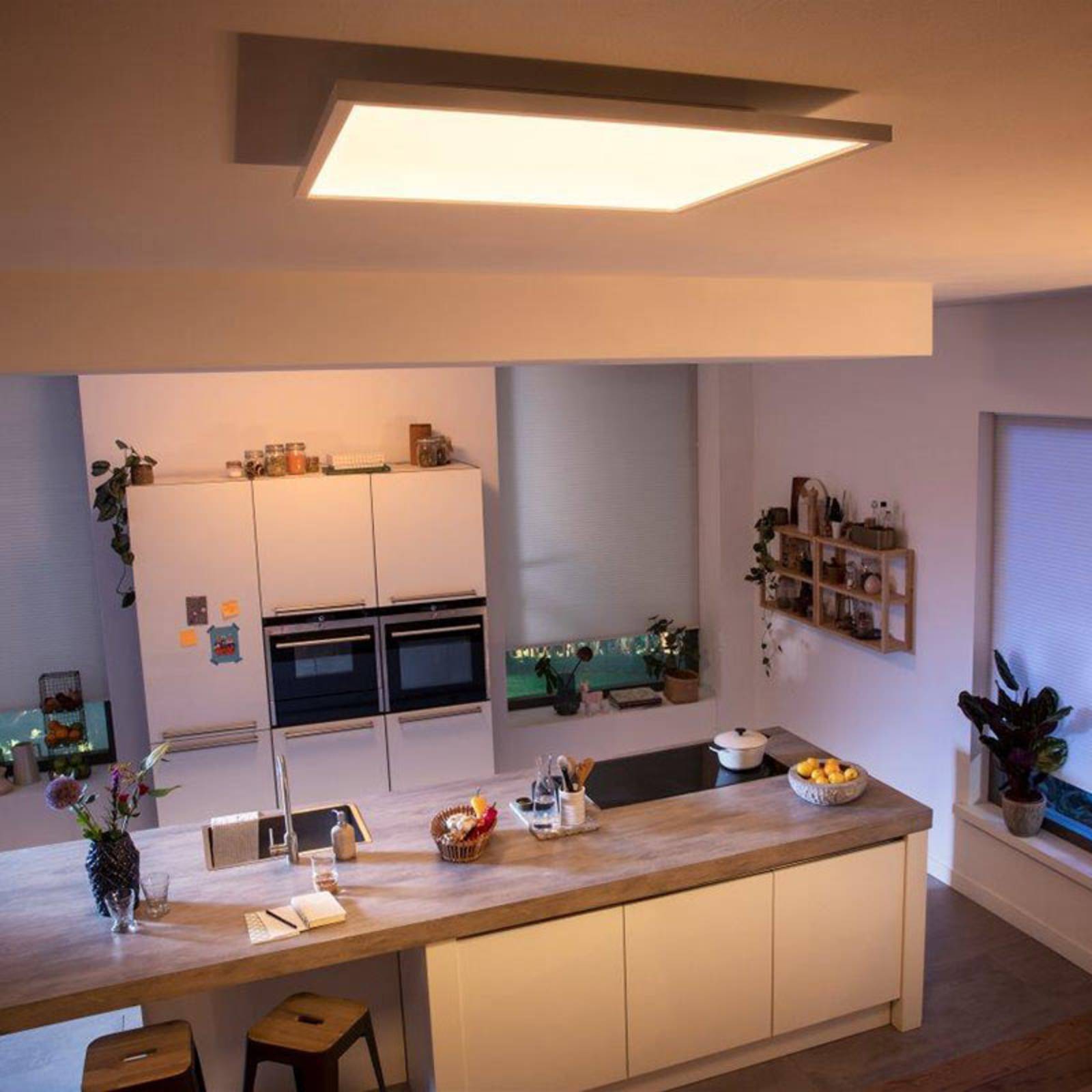 Hoekig Philips Hue LED plafondpaneel Aurelle met White Ambiance functieWarm wit licht om gezellig tv te kijken of krachtig daglicht om geconcentreerd te werken in de keuken – het Philips Hue LED plafondpaneel Aurelle zorgt altijd voor de perfecte sfeer. Het kan niet alleen in verschillende helderheidsniveaus of lichttemperaturen worden geschakeld, maar ook in verschillende modi – via de meegeleverde dimschakelaar, die al vier vooraf geïnstalleerde lichtrecepten heeft, of via een app met de smartphone of tablet. Dankzij het platte ontwerp is het paneel ideaal voor gebruik in ruimtes met een lage plafondhoogte.Eigenschappen / Compatibiliteit- Bediening via Hue-dimschakelaar (meegeleverd)- Bedienbaar met bijpassende Hue-app (ZigBee) en Hue Bluetooth-app- Instelbare kleurtemperaturen: warm wit (2.200 K) tot daglicht (6.500 K)- intelligente lichtregeling Optie a: ZigBee-integratie via bridge en router, zoals de Philips Hue Bridge (zie accessoires); dit maakt bediening lokaal of onderweg mogelijk via de Hue-app en de optie van spraakbediening via Amazon Alexa, Apple HomeKit (Siri) en Google Assistant. – slimme verlichtingsbediening optie b: directe bediening ter plaatse via Bluetooth met gratis Hue Bluetooth app. Bij gebruik van meer dan tien lampen binnen de Bluetooth-bediening wordt het gebruik van een bridge aanbevolen. Opmerking: Niet alle functies zijn beschikbaar bij bediening via de dimschakelaar.