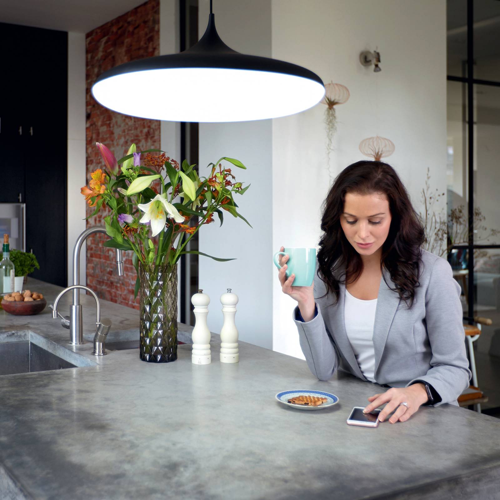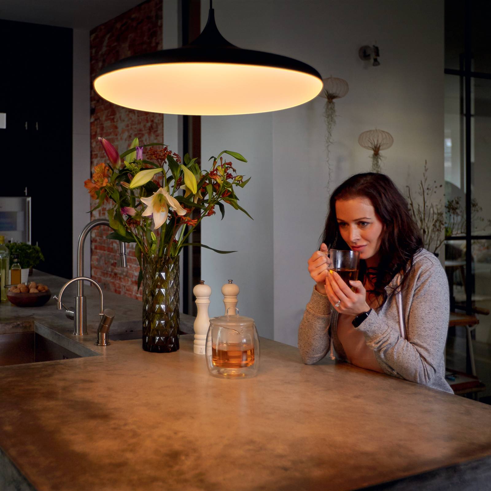 ZigBee ingeschakeld Philips Hue LED hanglamp Cher inclusief dimschakelaar Niet alleen het design, maar ook de mogelijkheid om het licht individueel te sturen maken de Cher LED-pendelarmatuur tot een absolute must-have in het moderne leven. Het armatuur is gemaakt van robuuste kunststof en is voorzien van een organisch gevormde lampenkap die aan de onderzijde overgaat in een gesatineerde diffusorkap. De diffusor zorgt niet alleen voor een zachte en niet-verblindende verlichting, maar ook voor een zeer homogene verdeling van het licht, zodat het te verlichten tafeloppervlak optimaal wordt verlicht. Een bijzondere highlight is de meegeleverde dimschakelaar, waarmee niet alleen de helderheid naar wens kan worden ingesteld, maar die ook vier verschillende voorgeprogrammeerde lichtmodi biedt. Dit maakt het gemakkelijk om het licht individueel aan te passen aan elke situatie of elk moment van de dag. Omdat de lamp ook is voorzien van de zogenaamde ZigBee-standaard, kan hij worden geïntegreerd in een bestaand slim thuissysteem en dus ook gemakkelijk worden bediend via een app op een smartphone of tablet. De app biedt ook talloze andere instelmogelijkheden en maakt het mogelijk om uw eigen verlichtingsscenario’s te creëren en op te slaan. Ook hier kan de Bluetooth-technologie worden gebruikt. De bijpassende Philips Hue Bluetooth-app maakt bediening via smartphone of tablet mogelijk zonder dat er een brug of een bestaand slim thuissysteem nodig is. Eenvoudig, handig en toch heel slim. Bijzondere kenmerken / compatibiliteit – Bedienbaar met de Hue-dimschakelaar (bij de levering inbegrepen) – dimbaar (via app of dimschakelaar) – compatibel met het bestaande Philips Hue systeem – bestuurbaar met bijpassende Hue app en Hue Bluetooth app – compatibel met op ZigBee gebaseerde systemen zoals Innogy, Bosch, Magenta (Telekom) en Busch-Jäger – intelligente verlichtingsbesturing Optie a: ZigBee integratie via brug en router, zoals de Philips Hue Bridge (zie accessoires); dit maakt lokale of externe bediening mogelijk via Hue app en de optie van spraakbesturing via Amazon Alexa, Apple HomeKit (Siri) en Google Assistant. – intelligente lichtregeling Optie b: Directe aansturing ter plaatse via Bluetooth met gratis Hue Bluetooth-app. Als er meer dan tien lampen worden gebruikt binnen de Bluetooth-besturing, wordt het gebruik van een brug aanbevolen.
