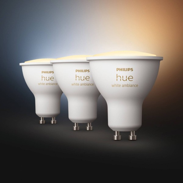 Philips Hue White Ambiance – LED-reflector GU10 5W, set van 3De slim regelbare GU10 LED-reflector Philips Hue White Ambiance biedt dimbaar licht in een breed scala aan witte tinten. Het praktische 3-pack maakt de vervanging van conventionele lampen door moderne, slim regelbare lichtbronnen mogelijk. U kunt kiezen tussen directe bediening met de tablet/smartphone via Bluetooth of integratie in een smart home systeem via ZigBee bridge. De Hue-dimschakelaar maakt het ook al mogelijk om te dimmen en voorgeprogrammeerde lichtscènes te selecteren.Technische gegevens:- 3-pack- verschillende witte lichttinten tussen warm wit (2.200 K) en daglicht (6.500 K)- Bluetooth-bereik binnenshuis ca. 10 mSpeciale kenmerken / Compatibiliteit:- bedienbaar met de Hue-dimschakelaar (zie accessoires)- bedienbaar met bijpassende Hue-app en Hue Bluetooth-app – compatibel met bestaand Philips Hue-systeem en andere op ZigBee gebaseerde systemen zoals van Innogy, Bosch, Telekom (Magenta) en Busch-Jäger – spraakbesturing mogelijk met Amazon Alexa, Apple HomeKit (Siri) en Google Assistant- Dimbaar via app, spraakcommando en dimschakelaar- Lichtbediening via ZigBee- Integratie in een bestaand smart home systeem via een bridge (bijvoorbeeld Philips Hue Bridge, zie accessoires). Volledige gebruiksmogelijkheid inclusief automatiseringen of bediening van onderweg (internetverbinding vereist).- Lichtbediening via Bluetooth – directe bediening ter plaatse met gratis Bluetooth app. Bij gebruik van meer dan tien lampen wordt het gebruik van een Bridge aanbevolen. In de Bluetooth-modus kunnen de functies aan/uit/dimmen en vooraf ingestelde scènes worden gebruikt.