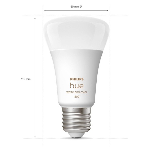 Witte en gekleurde ambiance – Philips Hue LED-lamp E27 6,5W, set van 4 De Philips Hue White and Color Ambiance LED-lamp met E27 fitting biedt dimbaar licht in miljoenen kleuren en verschillende tinten wit. De praktische set van 4 vervangt conventionele LED-lampen, zodat armaturen met E27-fitting kunnen worden geïntegreerd in slimme binnenverlichting. De LED-lamp kan via Bluetooth rechtstreeks met de smartphone/tablet worden bediend. De ZigBee integratie in een overeenkomstig smart home systeem opent de volledige waaier van functies om talrijke lampen tot slimme scènes te combineren. Met de Hue-dimschakelaar is ook een basisreeks van functies toegankelijk zonder dat extra hardware nodig is. Technische gegevens: – Set van 4 – 50.000 tinten wit – 16 miljoen kleuren – Bluetooth-bereik binnenshuis ca. 10 m Speciale kenmerken / compatibiliteit: – Bedienbaar met de Hue-dimschakelaar (zie accessoires). – Bedienbaar met bijpassende Hue app en Hue Bluetooth app – compatibel met bestaande Philips Hue-systemen en andere ZigBee-gebaseerde systemen zoals van Innogy, Bosch, Telekom (Magenta) en Busch-Jäger – Spraakbesturing mogelijk met Amazon Alexa, Apple HomeKit (Siri) en Google Assistant – Dimbaar via app, stemcommando en dimschakelaar – Verlichtingsbediening via ZigBee – integratie in een bestaand smart home-systeem via een bridge (bijvoorbeeld Philips Hue Bridge, zie accessoires). Volledige gebruiksmogelijkheden, inclusief automatiseringen of besturing onderweg (internetverbinding vereist). – Lichtbediening via Bluetooth – directe bediening ter plaatse met gratis Bluetooth app. Indien meer dan tien lampen worden gebruikt, wordt het gebruik van een brug aanbevolen. In de Bluetooth-modus kunnen de functies aan/uit/dimmen en vooraf ingestelde scènes worden gebruikt.