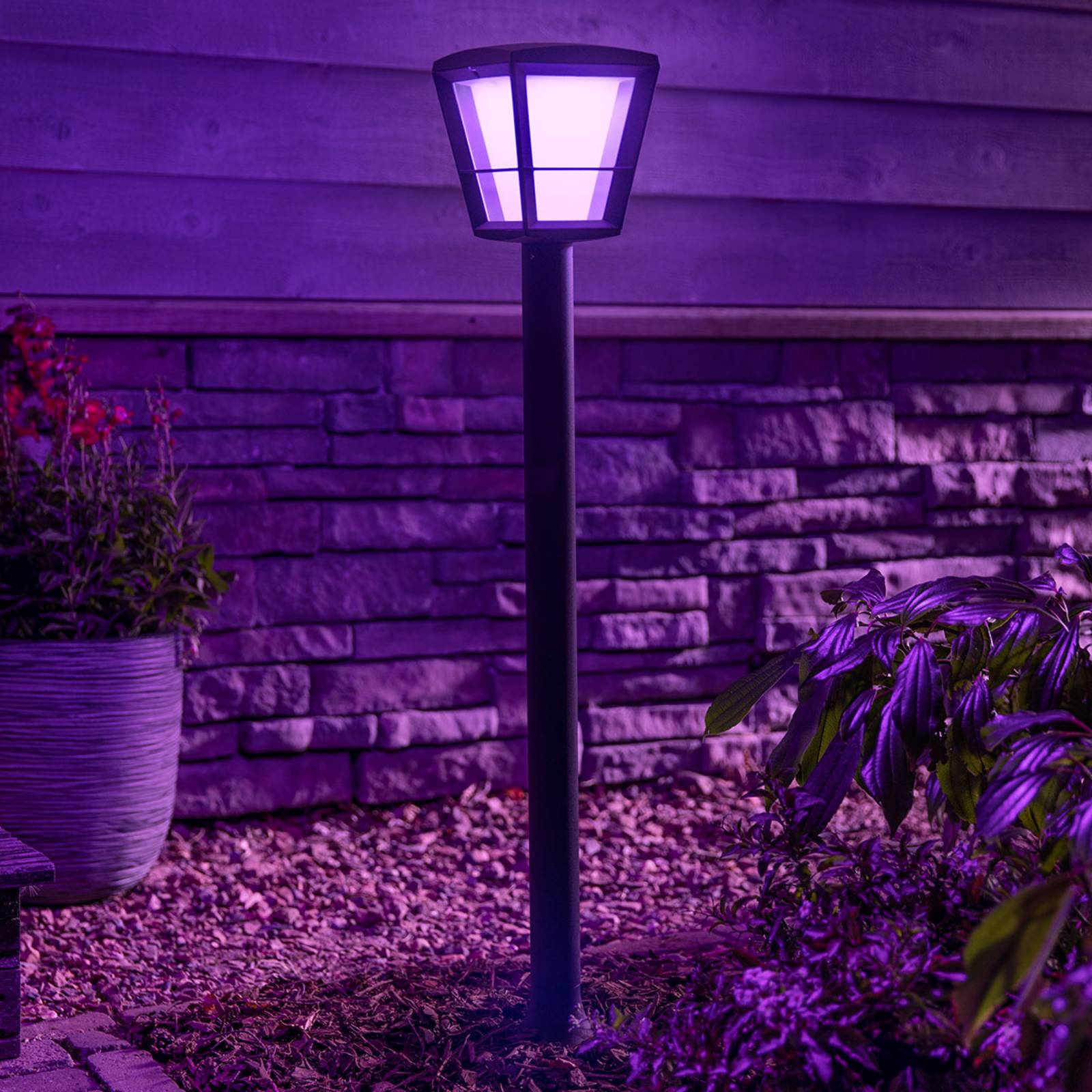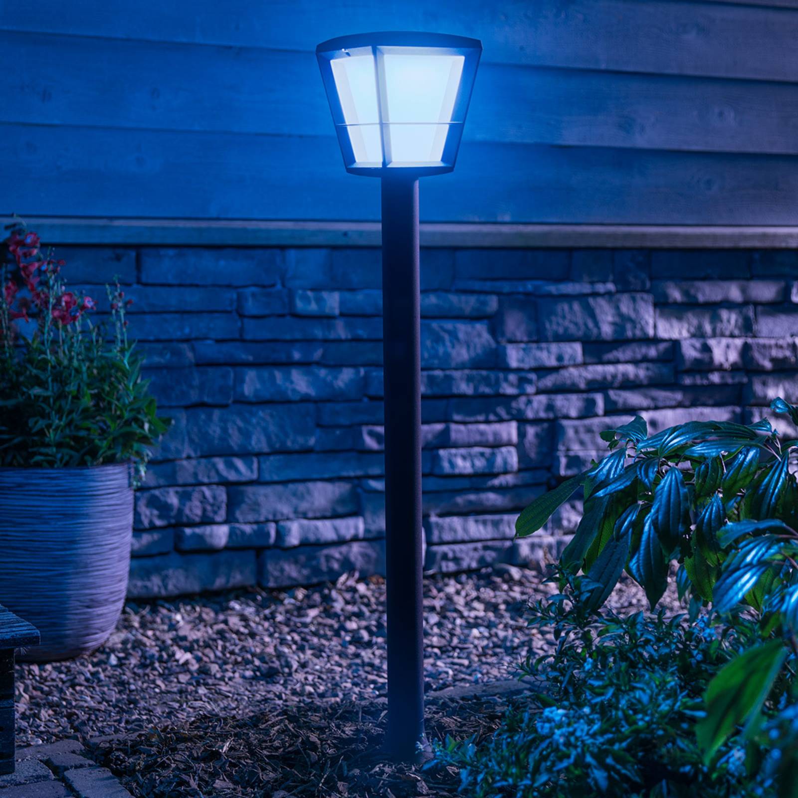 Slimme lichtinstallatie – Philips Hue White and Color Ambiance LED tuinpad verlichting Econic Talloze mogelijkheden, om de tuin en de buitengebieden van het huis te verlichten, biedt de moderne LED tuinpad verlichting Econic uit het Philips Hue-programma aan. Hiervoor moet gewoon de slimme lamp met een bestaand Hue- of bijbehorend Smart-Home-systeem gekoppeld en met de compatibele, gratis app verbonden worden. Of het nu voor het in- en uitschakelen, het dimmen of groeperen van meerdere lampen is, met het de app is een veelvoud aan instellingen mogelijk. De selectie vooraf ingestelde lichtscenario’s of lichtrecepten, zoals bijvoorbeeld concentreren of lezen, zijn eveneens mogelijk, zoals een tijdelijke programmering van de individuele lampen of diverse lampengroepen. Met behulp van een plaatsbepaling van de smartphone herkent de buitenverlichting, of er iemand naar huis komt of weggaat en schakelt ze het licht zelfstandig in of uit. Technische gegevens/compatibiliteit: – bestuurbaar en dimbaar via de Hue-app – warmwit (2.000 K) tot daglicht wit (6.500 K) – 16 miljoen kleuren voor een indrukwekkende buitenverlichting – compatibel met het beschikbare Philips-Hue-systeem – spraakbesturing mogelijk met Amazon Alexa, Apple HomeKit en Google Assistant – koppelbaar met de bewegingsmelder Hue Outdoor Sensor (zie accessoires) – compatibel met Hue Sync – licht in harmonie met de muziek – er is een verbinding met de Hue-Bridge noodzakelijk (zie accessoires) Opmerking: Voor een soepele werking van Hue-buitenverlichting, moet de eerste buitenlamp max. 10 m van de binnenin liggende Bridge of een Hue-lamp verwijderd zijn. Vervolgens zijn alle andere lampen in een afstand van max. 20 m. te installeren. Er geldt echter: hoe kleiner de afstand, des te beter.