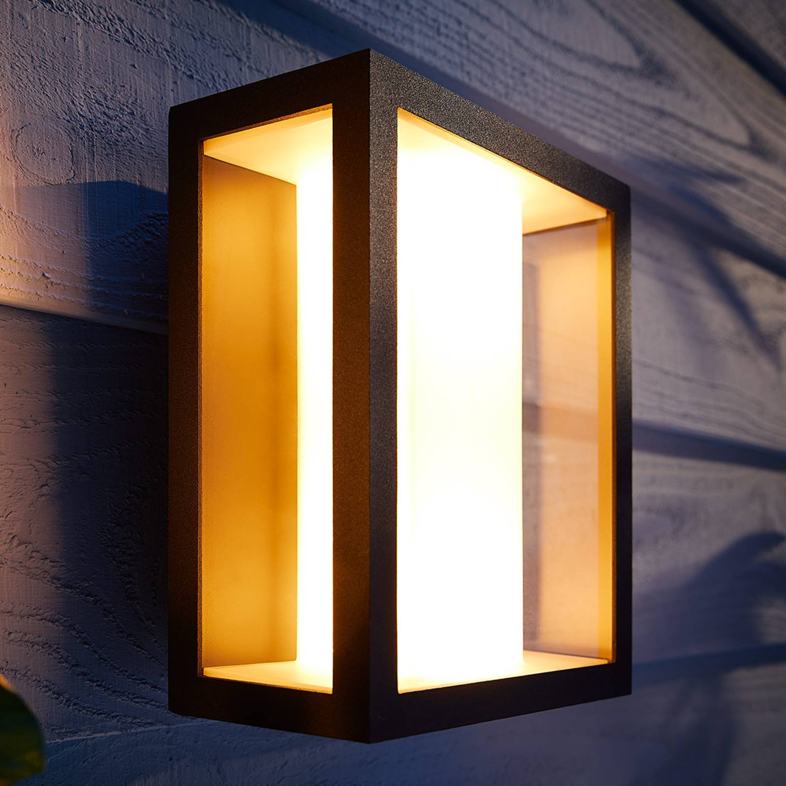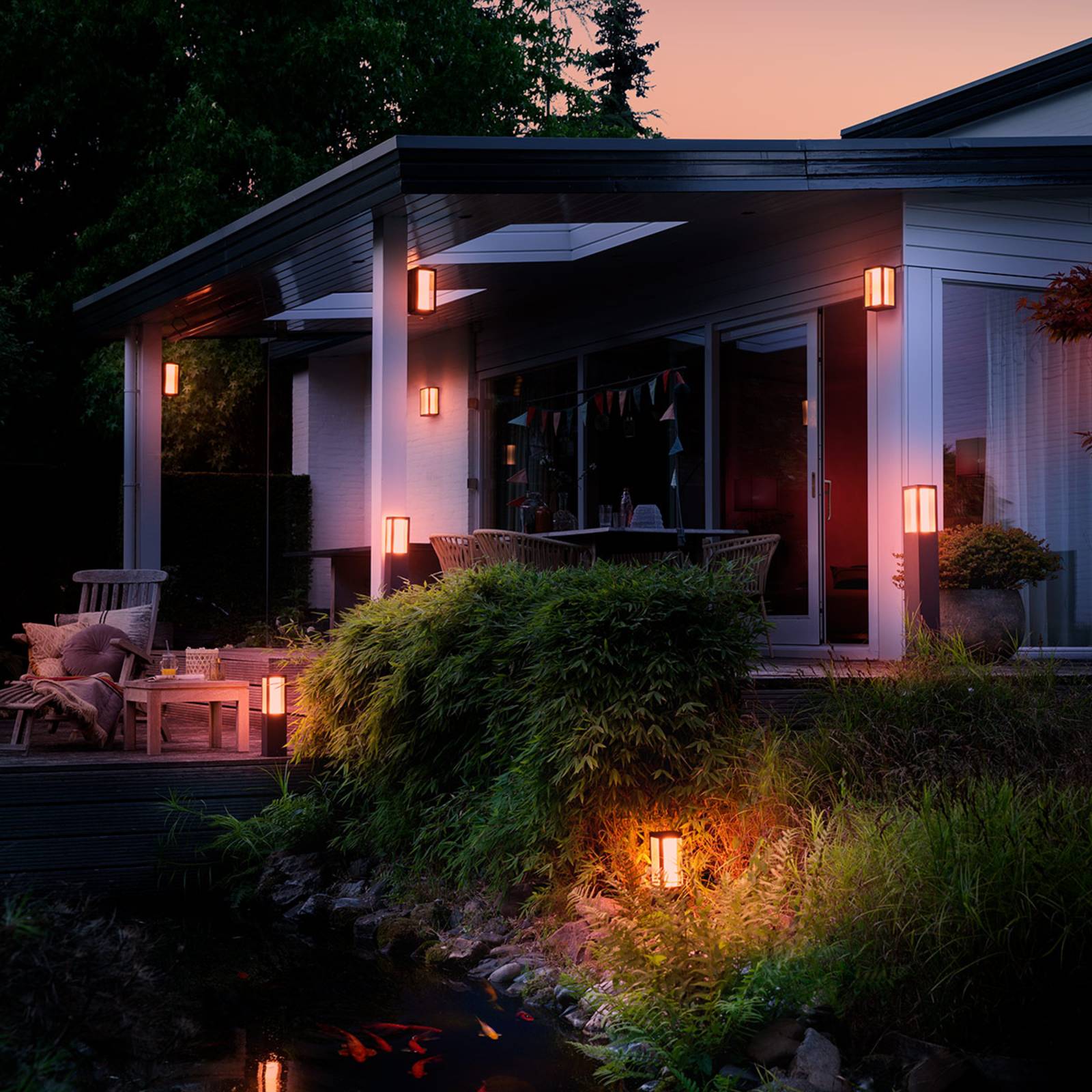 Moderne LED buitenwandlamp Philips Hue White and Color Ambiance Econic Met de innovatieve en intelligent bestuurbare wandlamp Impress ontstaat er kleur in de tuin. De geïntegreerde LED’s kunnen – na koppeling van de lamp met het beschikbare Philips-Hue-systeem – met een wittint uit een bereik tussen warm- en daglicht wit of één van de 16 miljoen fel uitstralen. Zo is op elk moment een individueel en uniek stemmings- en lichtconcept voor buiten mogelijk. Of het nu een verlichting voor de veiligheid op donkere paden en hoeken of een efficiënte sfeerverlichting voor een gezellig samenzijn op het terras is – met de slimme LED wandlamp Impress en het Hue-systeem is dit totaal geen probleem. De lamp kan met behulp van de app gedimd, tijdelijk bestuurd en gemakkelijk in-uitgeschakeld worden. Ook een groepering van meerdere lampen in verschillende gebieden is haalbaar. Technische gegevens/compatibiliteit: – dimbaar via de Hue-app – warmwit (2.000 K) tot daglicht wit (6.500 K) – 16 miljoen kleuren voor een indrukwekkende buitenverlichting – compatibel met het beschikbare Philips-Hue-systeem – spraakbesturing mogelijk met Amazon Alexa, Apple HomeKit en Google Assistant – koppelbaar met de bewegingsmelder Hue Outdoor Sensor (zie accessoires) – compatibel met Hue Sync – licht in harmonie met de muziek – er is een verbinding met de Hue-Bridge noodzakelijk (zie accessoires) Opmerking: Voor een soepele werking van Hue-buitenverlichting, moet de eerste buitenlamp max. 10 m van de binnenin liggende Bridge of een Hue-lamp verwijderd zijn. Vervolgens zijn alle andere lampen in een afstand van max. 20 m. te installeren. Er geldt echter: hoe kleiner de afstand, des te beter.