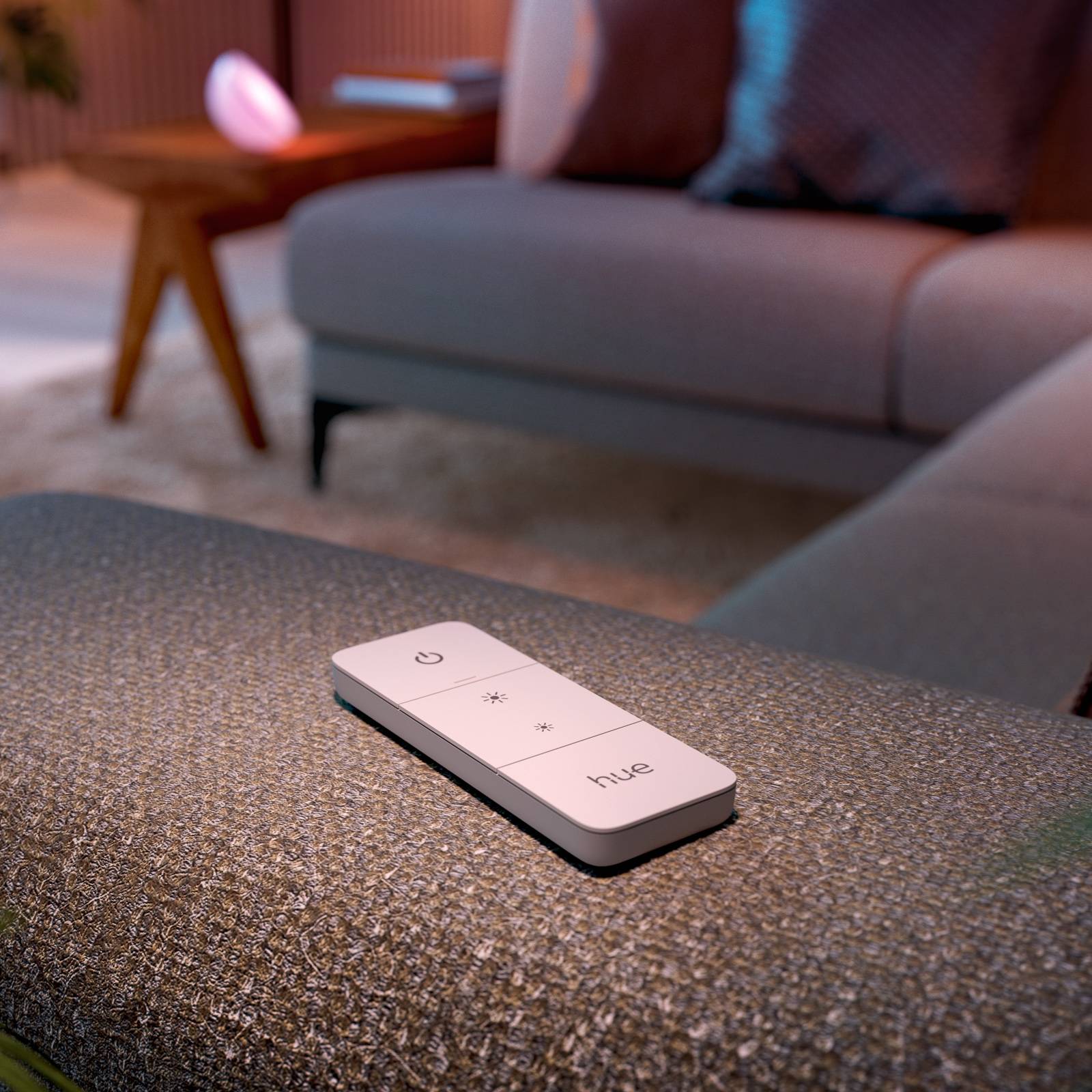 Philips Hue Draadloze Dimmerschakelaar V2 in vernieuwd design De dimschakelaar voor Philips Hue-lampen krijgt een update met de V2-versie. Net als voorheen overtuigt hij door zijn intuïtieve gebruiksvriendelijkheid, ongecompliceerde installatie zonder kabels en flexibele plaatsing met wandhouder en magnetisch vast te plakken schakelgedeelte. Het bovenste gedeelte wordt gebruikt om de aangesloten armaturen of lampen aan en uit te schakelen. Deze worden in hun respectieve geprogrammeerde instellingen geactiveerd, zodat bijvoorbeeld, afhankelijk van het tijdstip waarop de dimschakelaar wordt bediend, ‘s morgens de universeelwitte werkverlichting wordt ingeschakeld of ‘s avonds de warmwitte aanvullende verlichting. De velden in het middelste gedeelte worden gebruikt voor dimmen. Het onderste deel wordt gebruikt om te schakelen tussen de vier voorgeprogrammeerde scènes “Ontspannen”, “Lezen”, “Concentreren” en “Energie bijvullen”. Wanneer geïntegreerd in een Hue-systeem (bridge vereist), kunnen individueel geconfigureerde verlichtingsscènes ook worden toegewezen aan de onderste knop. Technische gegevens: – Leveringsomvang: schakelelement met knoopcel, wandhouder met schroeven en plakband voor de montage. – tot 10 Hue lampen/armaturen aanstuurbaar – Levensduur: tot 50.000 klikken – Omgevingstemperatuur in bedrijf: – 10 °C tot + 45 °C – Bereik: tot 12 m – Batterij: 1 x CR2450 (meegeleverd)